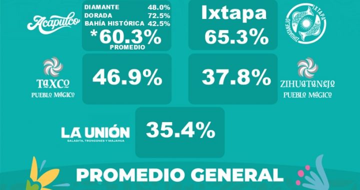 En el caso de Acapulco, se reporta un promedio de 60.3% en ocupación hotelera, en la zona Diamante se registra 48%, la zona Dorada cuenta con 72.5 puntos porcentuales, mientras que la zona de la Bahía Histórica registra una ocupación hotelera general de 42.5%.