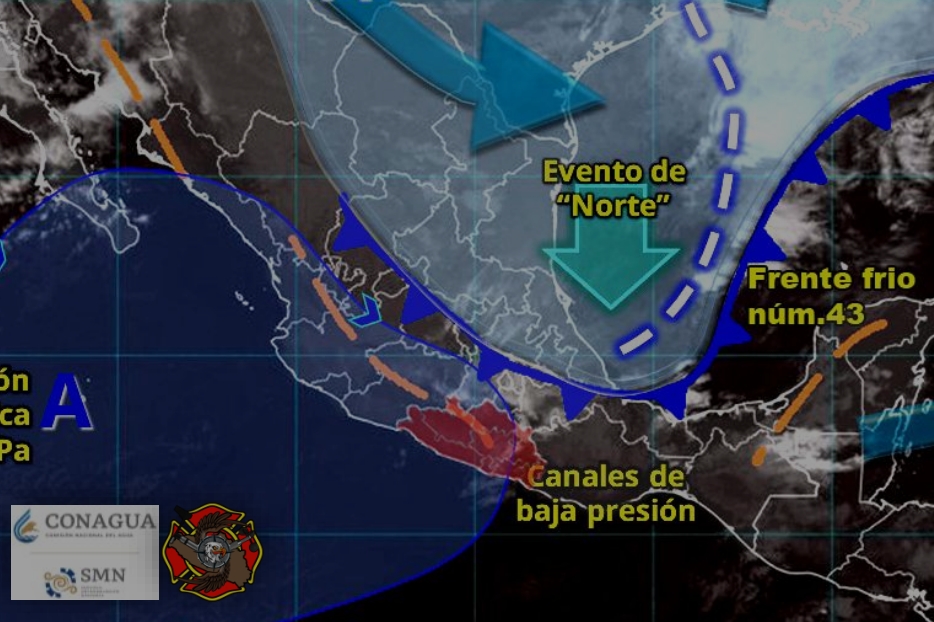 Esto se debe a que un canal de baja presión se extiende desde el centro y al oeste de Guerrero, por otro lado el frente frío número 43, localizado sobre el valle de México, ocasiona descenso en la temperatura así como lluvias en Guerrero por la tarde.