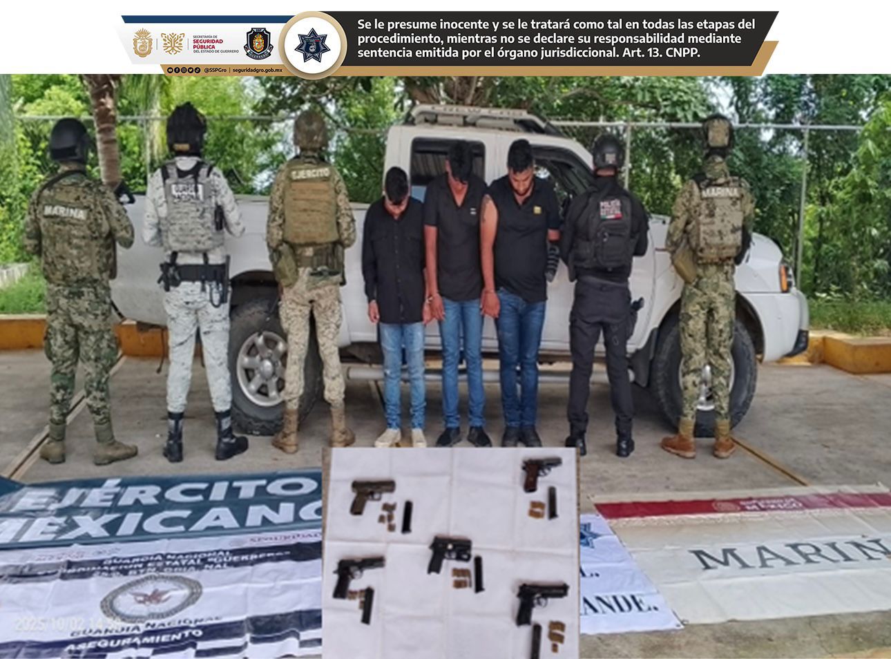 Chilpancingo, Guerrero, 03 de octubre de 2025.- En acciones estratégicas conjuntas en Zihuatanejo, municipio de la Región Costa Grande, autoridades detuvieron a tres individuos en posesión de armamento y un vehículo vinculado a probables hechos delictivos.