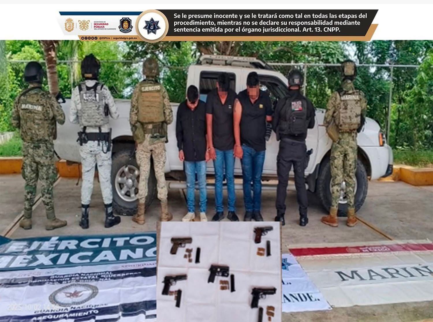 Chilpancingo, Guerrero, 03 de octubre de 2025.- En acciones estratégicas conjuntas en Zihuatanejo, municipio de la Región Costa Grande, autoridades detuvieron a tres individuos en posesión de armamento y un vehículo vinculado a probables hechos delictivos.