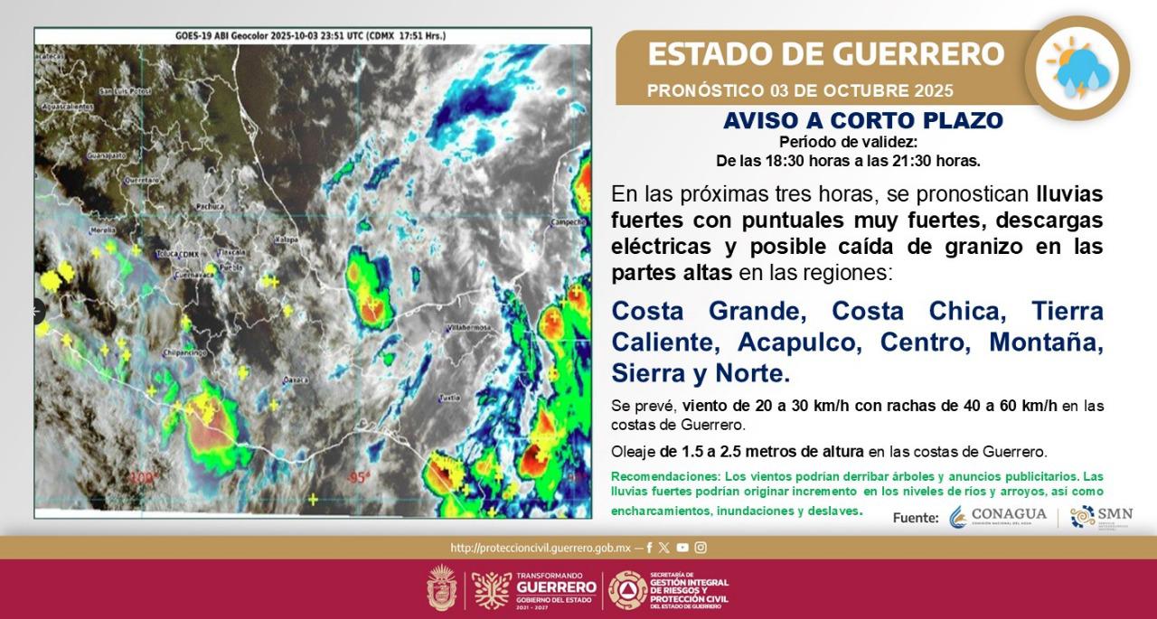 Chilpancingo, Gro., 03 de octubre de 2025.- La Secretaría de Gestión Integral de Riesgos y Protección Civil informa que en las próximas tres horas se pronostican lluvias fuertes con puntuales muy fuertes, descargas eléctricas y posible caída de granizo en las partes altas en las regiones: Costa Grande, Costa Chica, Tierra Caliente, Acapulco, Centro, Montaña, Sierra y Norte.