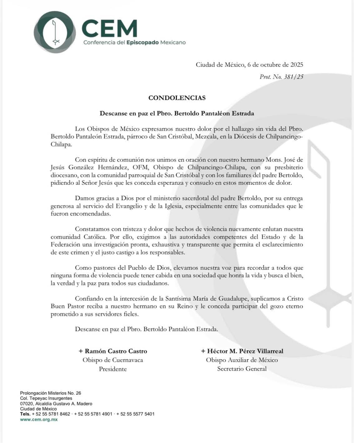 CONFERENCIA DEL EPISCOPADO DICE QUE LA VIOLENCIA ENLUTA A LA COMUNIDAD CATÓLICA (Comunicado)