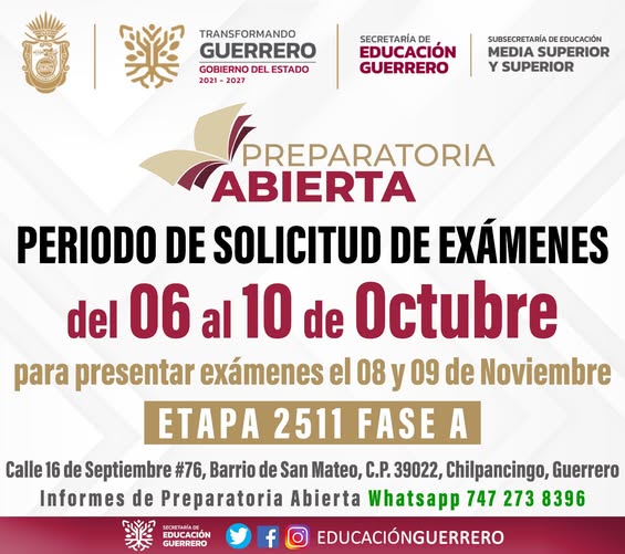 El Gobierno de Guerrero, encabezado por la gobernadora Evelyn Salgado Pineda, convoca a estudiantes interesados en presentar el examen de Preparatoria Abierta correspondiente a la etapa 2511 fase A.