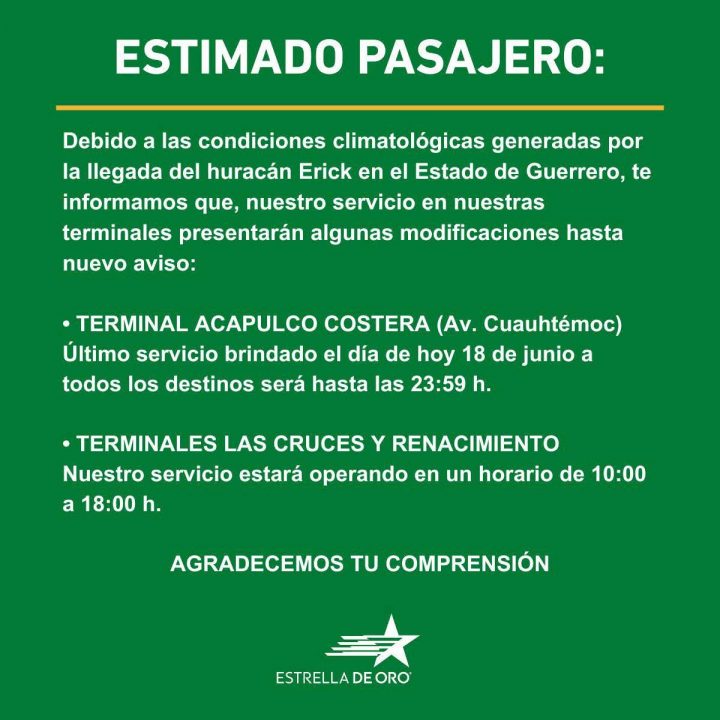 Acapulco, Guerrero., Junio 18-2025.- En Guerrero derivado de las medidas preventivas ante el impacto de Erick que pueda llegar con categoría de Huracán 3, el servicio de transporte aéreo y terrestre cerraron sus servicios de manera temporal.