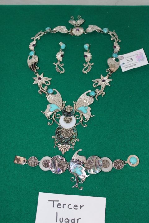 Las piezas que se presentaron fueron: Anillos, brazaletes, collares, aretes y dijes, fueron elaboradas con plata Ley 0.925 o más fina, cuando se combina con otros materiales, el 75 por ciento visible será plata y el resto de su superficie de otros materiales, como piedras preciosas o semipreciosas, concha, maderas preciosas y otros metales.