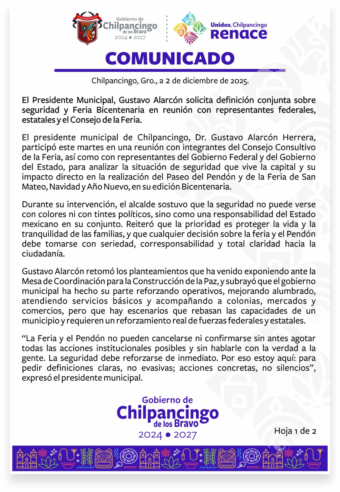 El Gobierno Municipal reiteró que los trabajos organizativos de la Feria y del Paseo del Pendón continúan, pero que su realización definitiva dependerá de las condiciones de seguridad que se logren construir en los próximos días y de la definición conjunta entre Federación, Estado y Municipio.