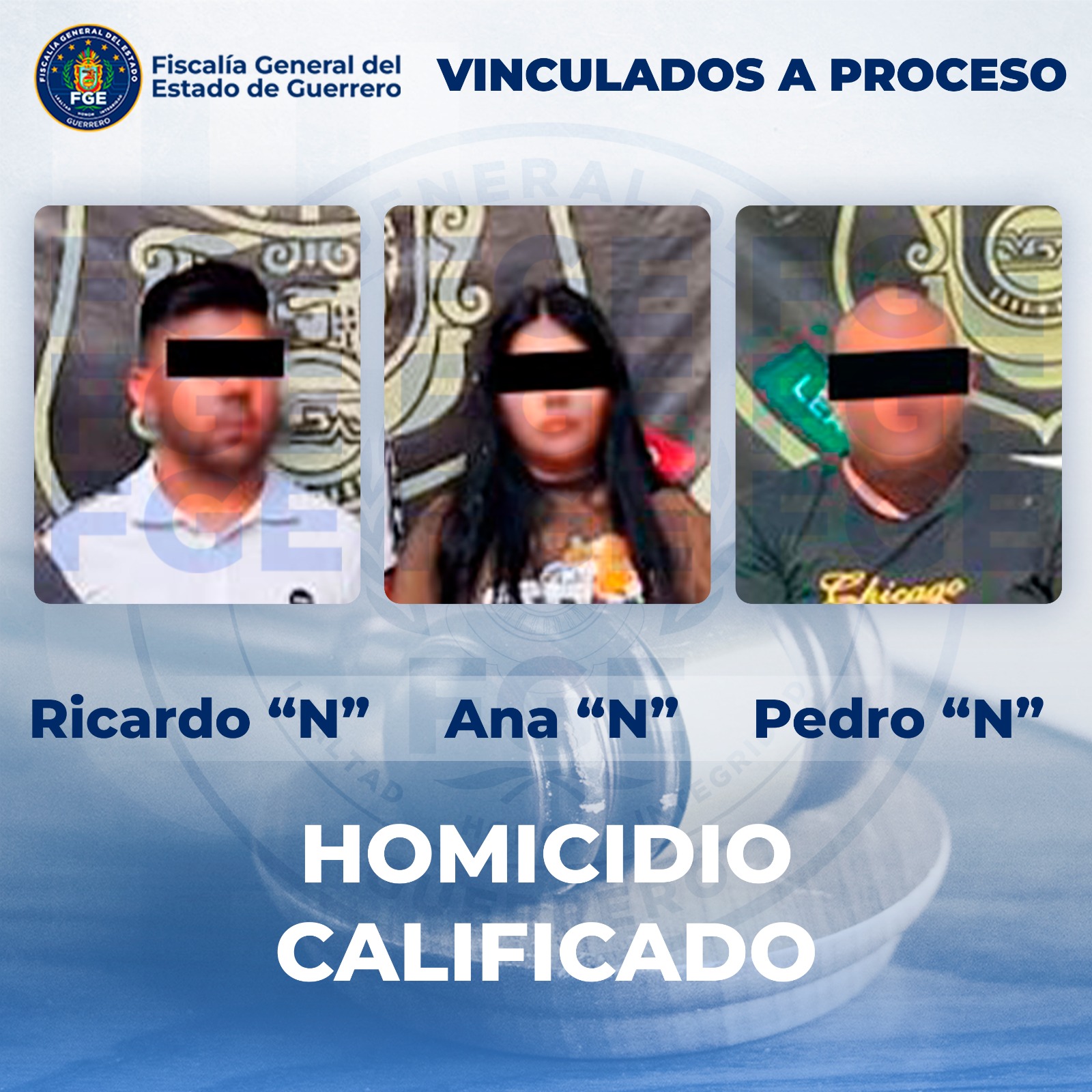 Chilpancingo, Gro., a 30 de septiembre de 2025. – La Fiscalía General del Estado de Guerrero informa que obtuvo vinculación a proceso en contra de Ana “N”, Ricardo “N” y Pedro “N”, por su probable responsabilidad en el delito de homicidio calificado, en agravio de Luis “N”, en hechos ocurridos en el municipio de Acapulco de Juárez.
