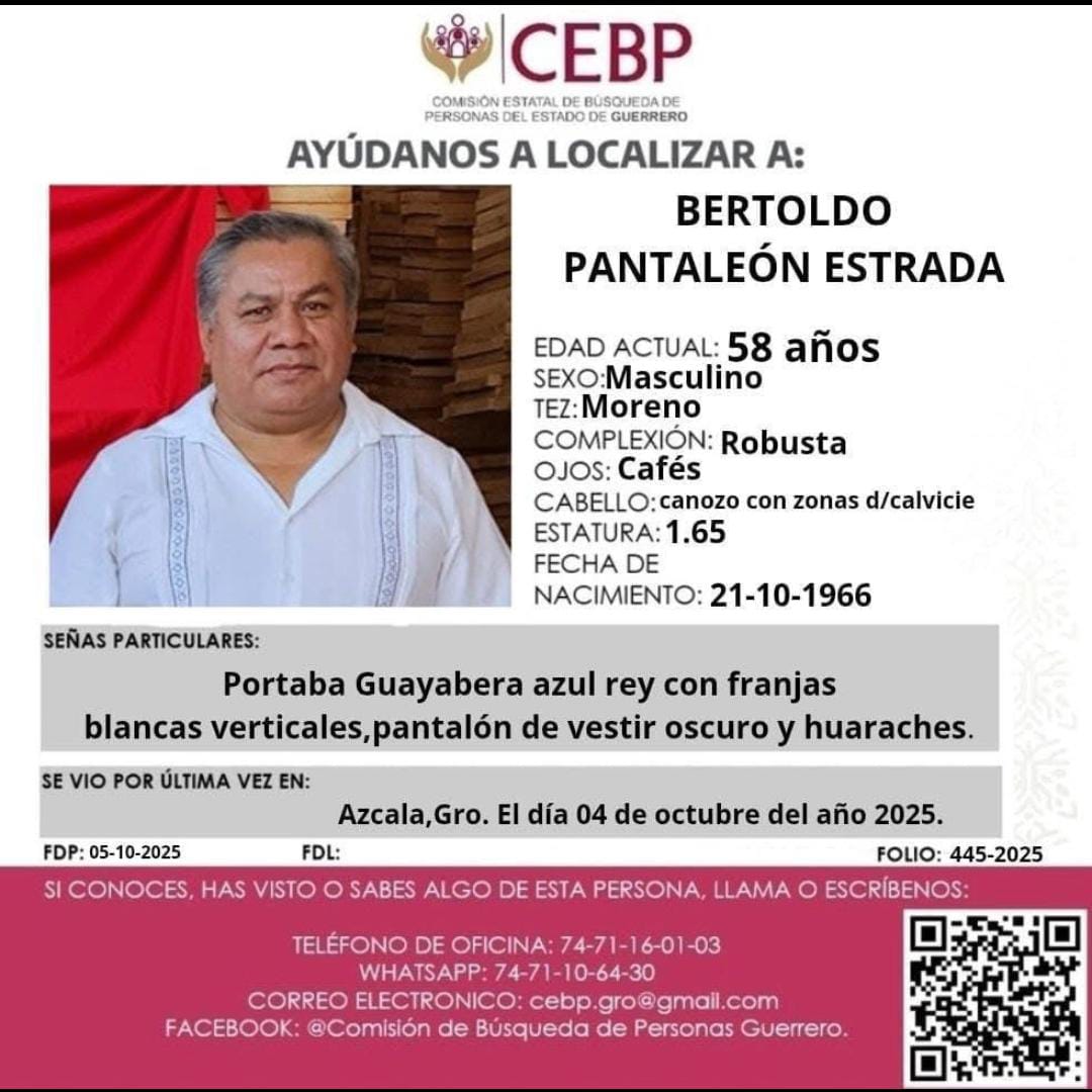 Por su parte la Comisión Estatal de Búsqueda de Personas del Estado de Guerrero emitió una ficha de búsqueda con el folio 445-2025, en el que señala que el Padre Bertoldo Pantaleón Estrada fue visto la última vez en Azcala, Guerrero, el día 4 (sábado) de octubre del año 2025.