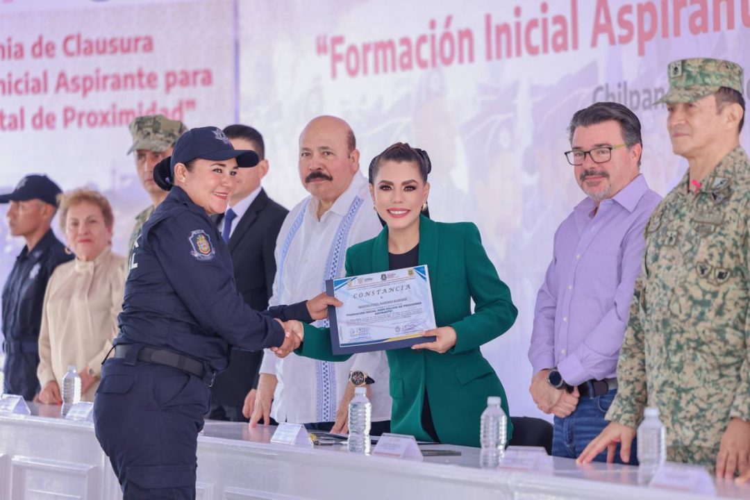 Chilpancingo, Gro., 10 de octubre de 2025. – La gobernadora Evelyn Salgado Pineda encabezó la ceremonia de graduación del primer escalón 2025 del Curso de Formación Inicial para Policía Estatal de Proximidad, donde 69 nuevos elementos, entre ellos 36 mujeres, culminaron su adiestramiento y capacitación especializada para incorporarse a los trabajos de paz, seguridad y atención ciudadana de la Secretaría de Seguridad Pública de Guerrero.