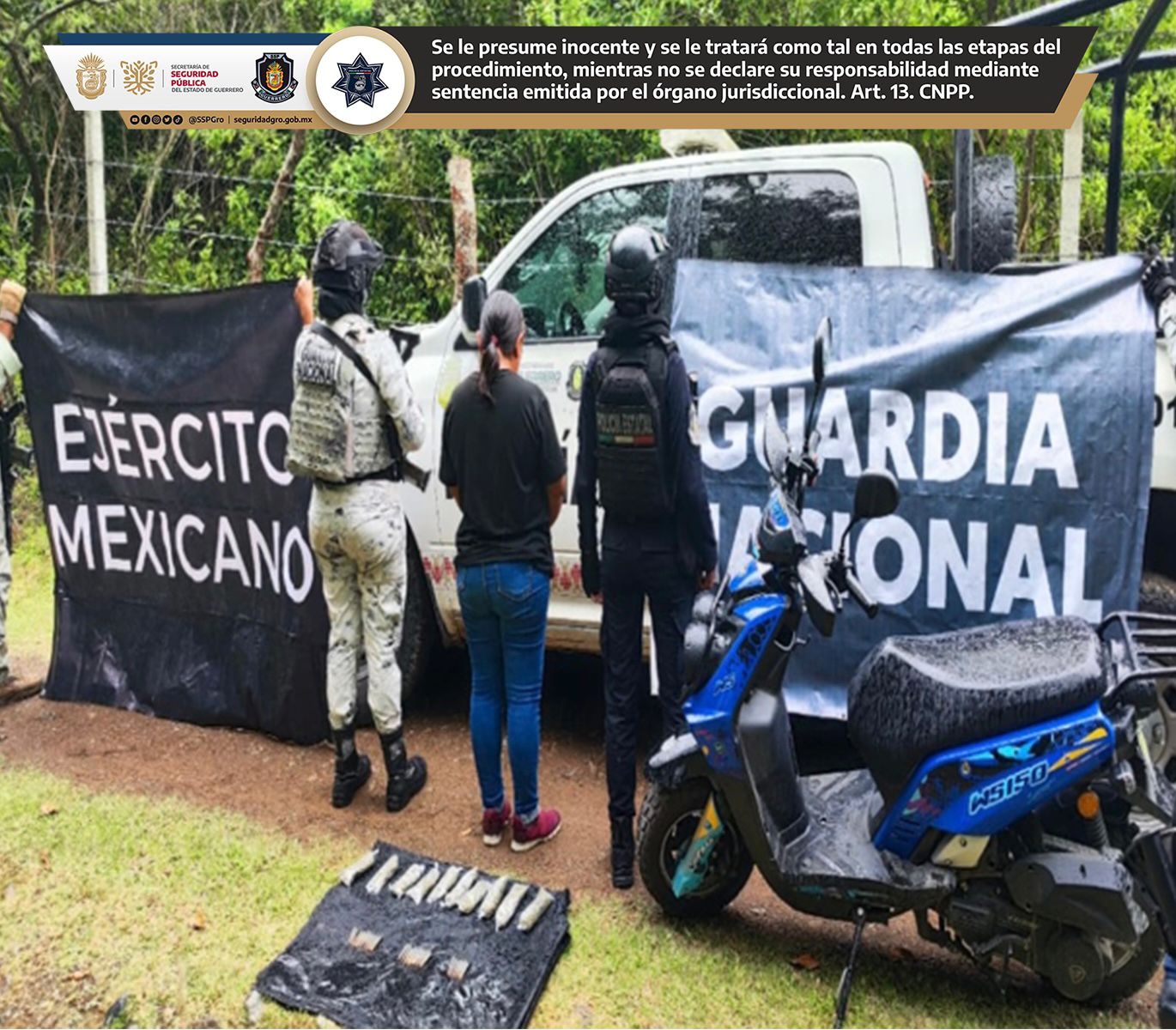 Durante estas acciones, se logró la detención de una femenina, a quien se le aseguró: 10 bolsitas con probable marihuana, con un peso aproximado de 230 gramos; 26 cartuchos; y una motocicleta vinculada con un hecho delictivo.