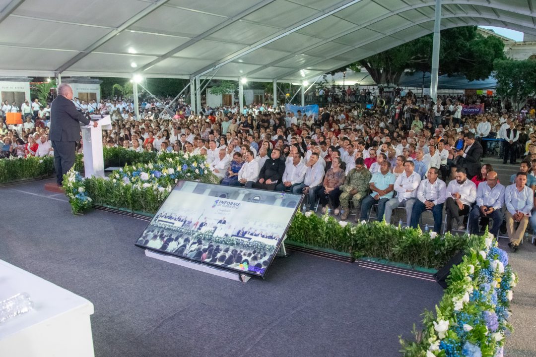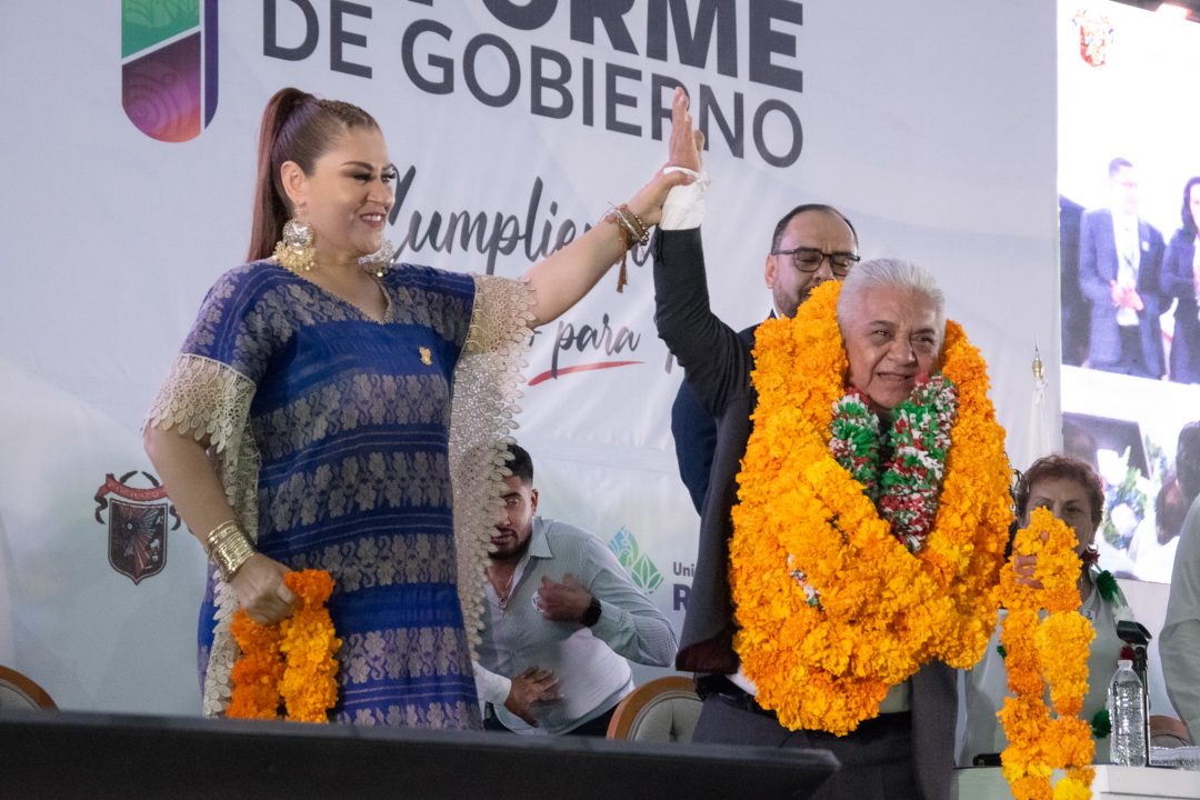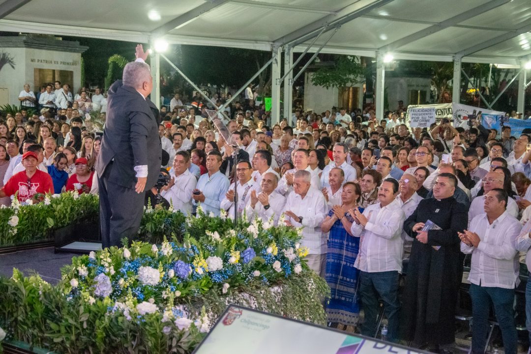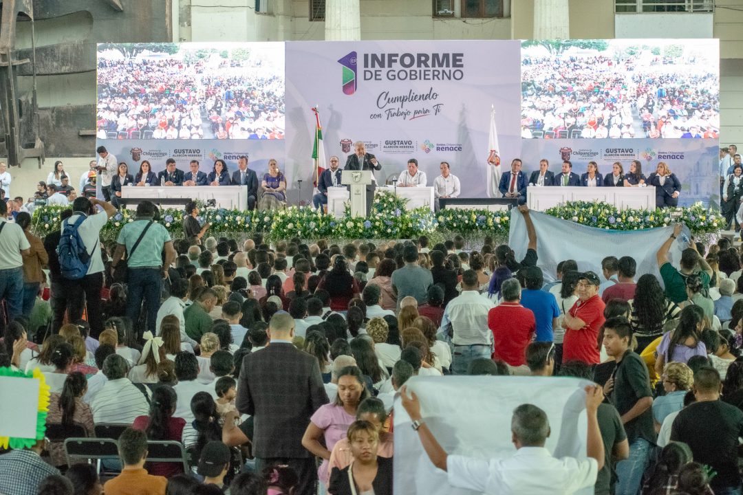 Chilpancingo, Guerrero.– En un Zócalo abarrotado por más miles de habitantes que llegaron desde colonias, comunidades y localidades del municipio, el presidente municipal Gustavo Alarcón rindió su Primer Informe de Gobierno, acompañado por la representante de la gobernadora Evelyn Salgado Pineda, la Dra. Anacleta López Vega, así como por personalidades políticas nacionales, estatales y municipales.