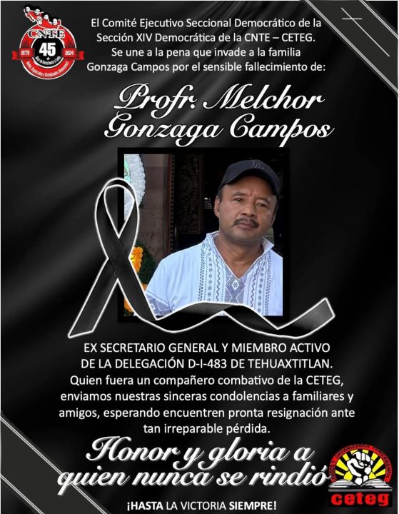 Melchor Gonzaga Campos de profesión profesor, estaba integrado a la CETEG, Coordinadora Estatal de Trabajadores de la Educación y también formaba parte de la Policía Comunitaria de la localidad de Tehuaxtitlán, perteneciente a este municipio.