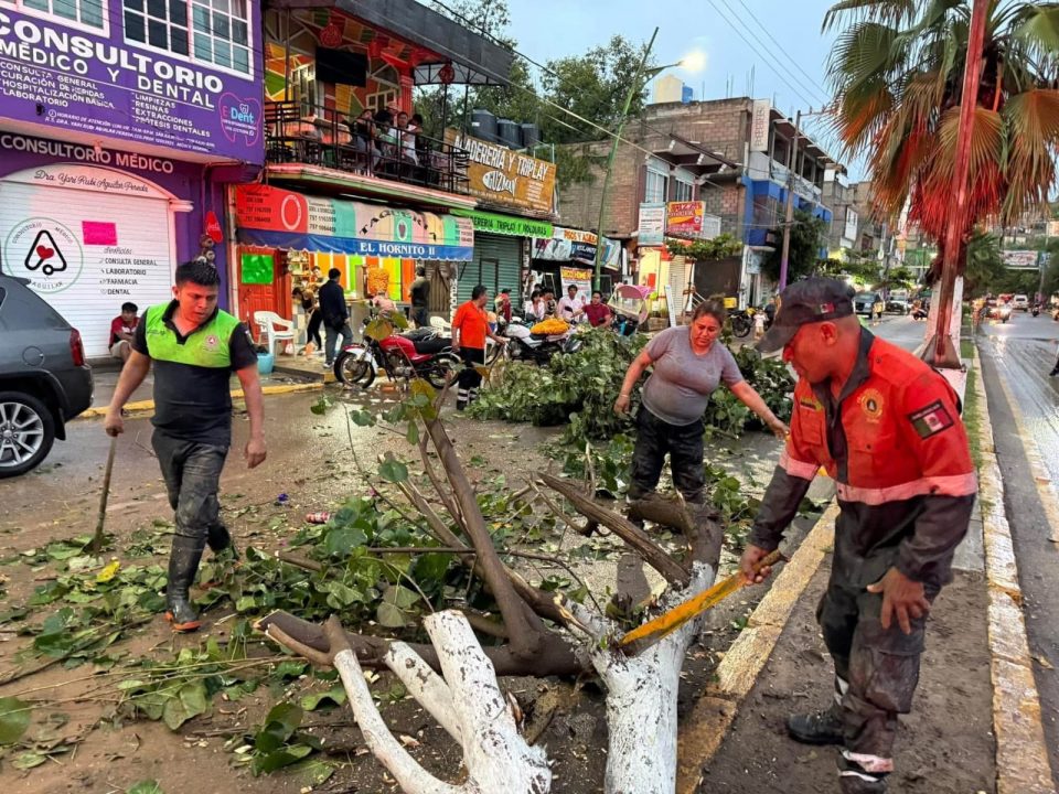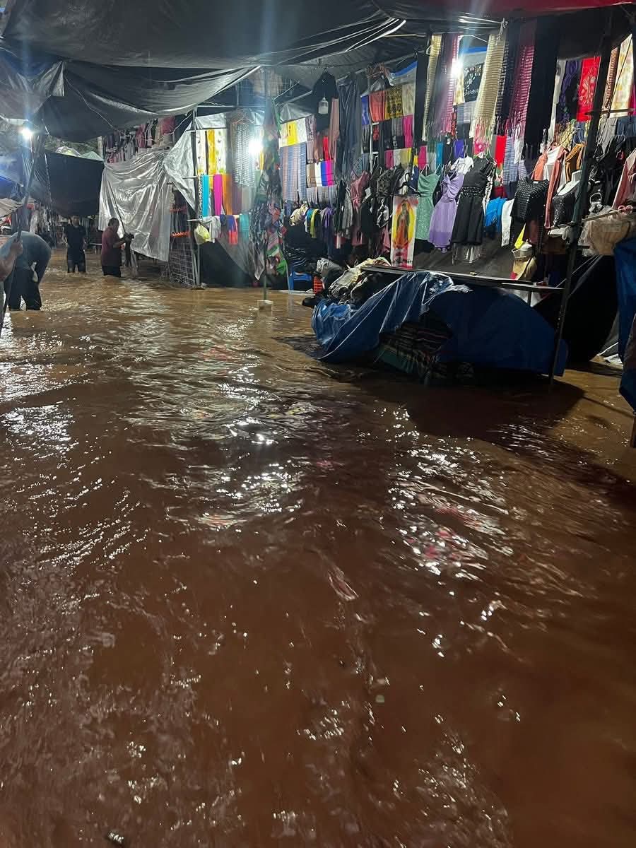 Tlapa de Comonfort, Guerrero., Octubre 18-2025.- La tarde de este sábado una fuerte tromba en esta ciudad dejó afectaciones a casas de al menos 4 colonias, en el Hospital de la Madre y el Niño Indígena, en el comercio informal ubicado en el rio Jale, arrastre de autos, caída de arboles, personas varadas.