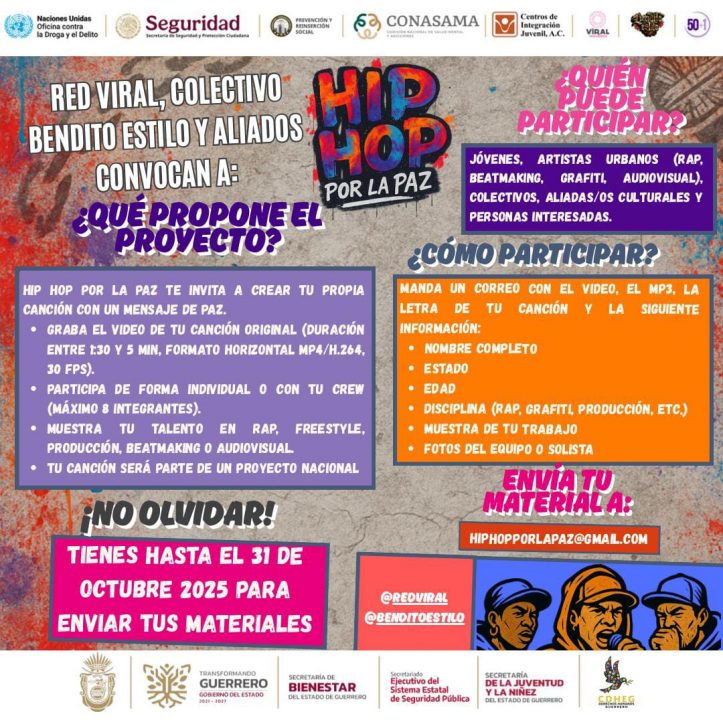 Chilpancingo, Gro., 20 de octubre de 2025.- Con el objetivo de abrir más espacios de expresión a jóvenes, artistas urbanos y personas privadas de la libertad interesados en transmitir mensajes positivos a través del rap, el comité organizador del concurso “Hip Hop por la Paz”, impulsado por el Colectivo Red Viral y el Colectivo Bendito Estilo, anunció la ampliación de la convocatoria en Guerrero hasta el 31 de octubre, buscando transformar la cultura del Hip Hop en una herramienta de prevención del delito, reconstrucción del tejido social y promoción de los derechos humanos.