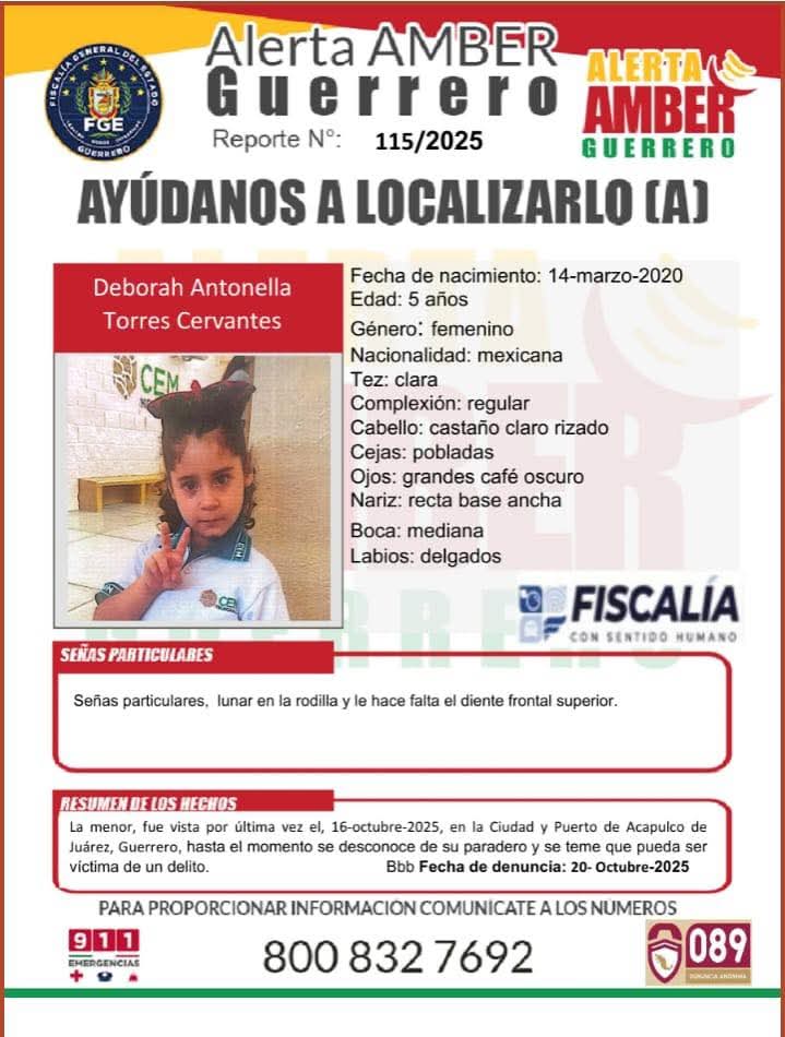 Los datos de la Alerta Ámber indican que Deborah tiene 5 años y que fue vista por última vez el jueves 16 de octubre del año en curso en el puerto de Acapulco.