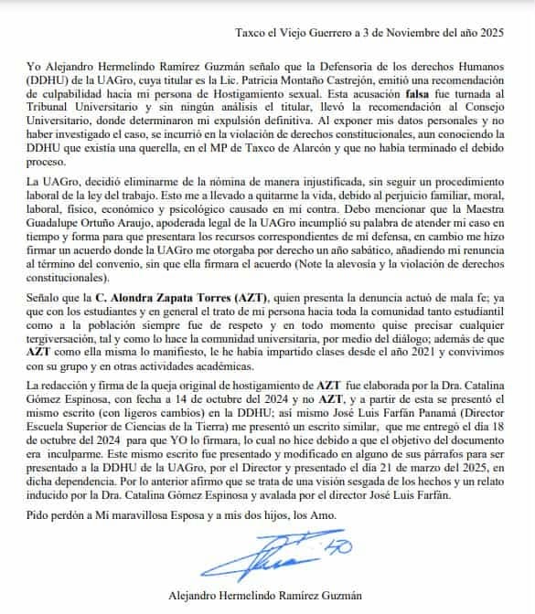 El hoy occiso dejó una carta póstuma que está fechada en 3 de Noviembre del 2025, el profesor expulsado de la escuela de Ciencias de la Terra señala que la Defensoría de los Derechos Humanos (DDHU) de la UAGro cuyo titular es la Lic. Patricia Montaño Castrejón, emitió una recomendación de culpabilidad hacia su persona de hostigamiento sexual.