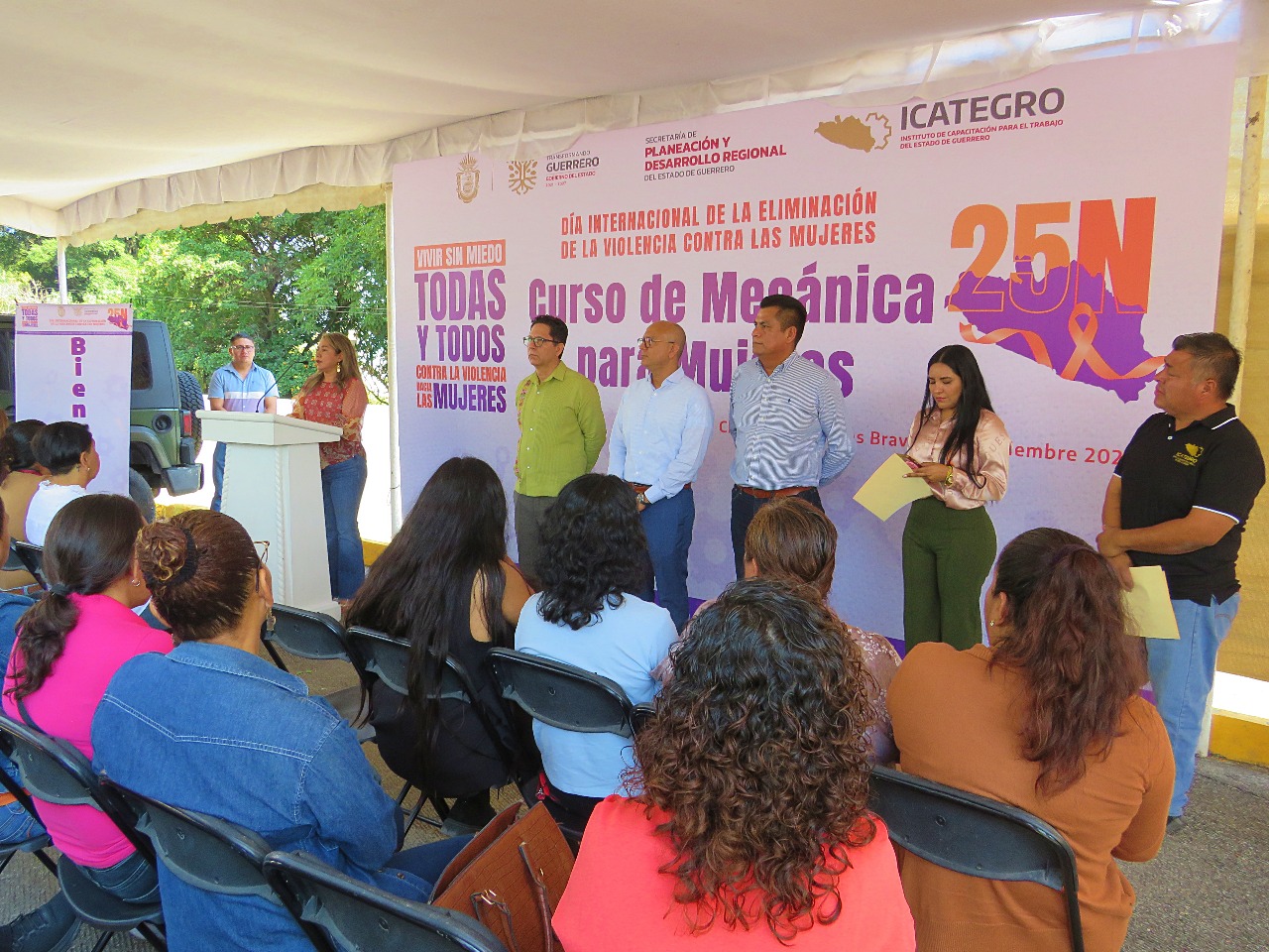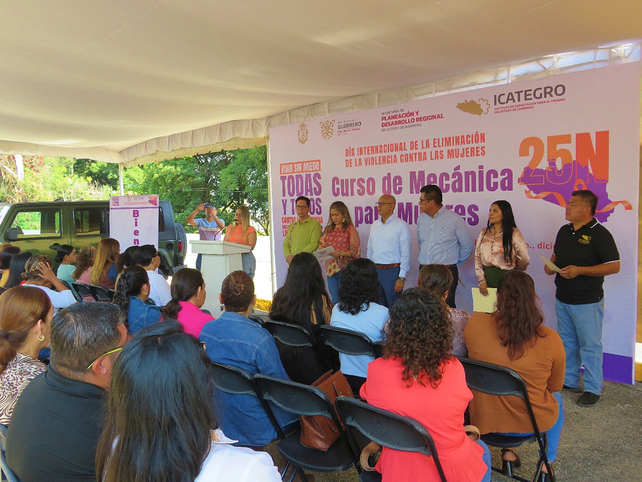 Guerrero avanza en la construcción de un estado más igualitario y con mayores oportunidades para las mujeres*Se inaugura el curso “Mecánica Automotriz para Servidoras Públicas del Gobierno del Estado”Chilpancingo, Gro., 03 de diciembre de 2025.- En el marco de los 16 Días de Activismo para la Erradicación de la Violencia contra las Mujeres, el gobierno del Estado que preside la gobernadora Evelyn Salgado Pineda, continúa realizando diversas actividades enfocadas en esta temática de la No violencia y respaldo a las mujeres, por lo anterior la Secretaría de Planeación y Desarrollo Regional (SEPLADER) y el Instituto de Capacitación para el Trabajo del Estado de Guerrero (ICATEGRO) inauguraron el curso “Mecánica Automotriz para Servidoras Públicas del Gobierno del Estado”, que se realiza a partir del 3 al 9 de diciembre.La inauguración estuvo a cargo de los titulares de SEPLADER e ICATEGRO, René Vargas Pineda y Marco Antonio Marbán Galván, respectivamente, quienes dijeron que el objetivo de esta capacitación es promover el fortalecimiento de las capacidades técnicas de las mujeres, impulsar su autonomía y abrir espacios de formación en áreas tradicionalmente masculinizadas, avanzando así en la construcción de un Guerrero más igualitario y con oportunidades para todas.Durante su mensaje, el titular de SEPLADER, René Vargas Pineda destacó que este curso surge por instrucción de la gobernadora Evelyn Salgado Pineda, quien ha impulsado políticas públicas dirigidas a garantizar la igualdad, la seguridad y el empoderamiento de las mujeres en Guerrero. Señaló que esta iniciativa representa un paso firme hacia la apertura de nuevas oportunidades y hacia el fortalecimiento de las capacidades de las mujeres en áreas donde históricamente se les ha limitado.“Este proyecto no solo impulsa el aprendizaje técnico, sino que abre camino a la igualdad y a la autonomía económica. La mecánica automotriz puede parecer un oficio ajeno a las mujeres, pero la verdad es que no existe un solo ámbito donde ellas no puedan estar, aprender y brillar”, enfatizó Vargas PinedaAsimismo, reconoció el esfuerzo de las servidoras públicas asistentes: “Cada una de ustedes demuestra que la participación de las mujeres en sectores técnicos no solo es posible, sino necesaria. Cuando una mujer aprende, se transforma ella y transforma su entorno”.Finalmente, agradeció el trabajo coordinado de la Unidad de Género de SEPLADER, a cargo de Ana Laura Morlet Damián y del ICATEGRO para hacer posible este curso, destacando que el gobierno estatal continuará impulsando acciones que fortalezcan la formación, el desarrollo y la protección de las mujeres guerrerenses.Durante el acto inaugural se contó con la presencia de Mario Raymundo Ochoa Núñez, Subsecretario de Desarrollo Regional y Concertación; Blanca Regina Valle Calvo, directora general de Convenios para el Desarrollo Sostenible; Jaime Alberto Soria Villa, director general de Administración y Finanzas y José Omar Alvarado Castillo, director general de Control Patrimonial.