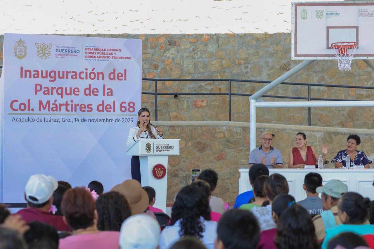 Acapulco, Gro., 14 de noviembre de 2025.- Refrendando su compromiso para seguir llevando obras que mejoren la vida de los habitantes de Acapulco, la gobernadora Evelyn Salgado Pineda, inauguró las instalaciones del parque de la colonia Mártires del 68, en donde se destinó una inversión de poco más de 7 millones de pesos para la construcción de la cancha, las áreas comunes, alumbrado, aparatos de ejercicio, juegos infantiles, entre otros beneficios. Se trata de un esfuerzo enfocado en el bienestar de las familias que habitan en ese centro poblacional de la parte alta del puerto, generando más y mejores opciones para la activación y promoción del deporte.