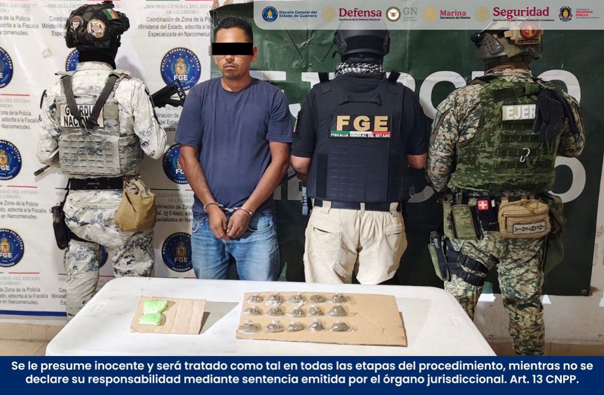 La detención se llevó a cabo sobre la carretera federal Chilpancingo–Petaquillas, donde, durante una inspección, al imputado le fueron aseguradas 15 dosis de hierba verde seca, con características propias de la droga conocida como marihuana.