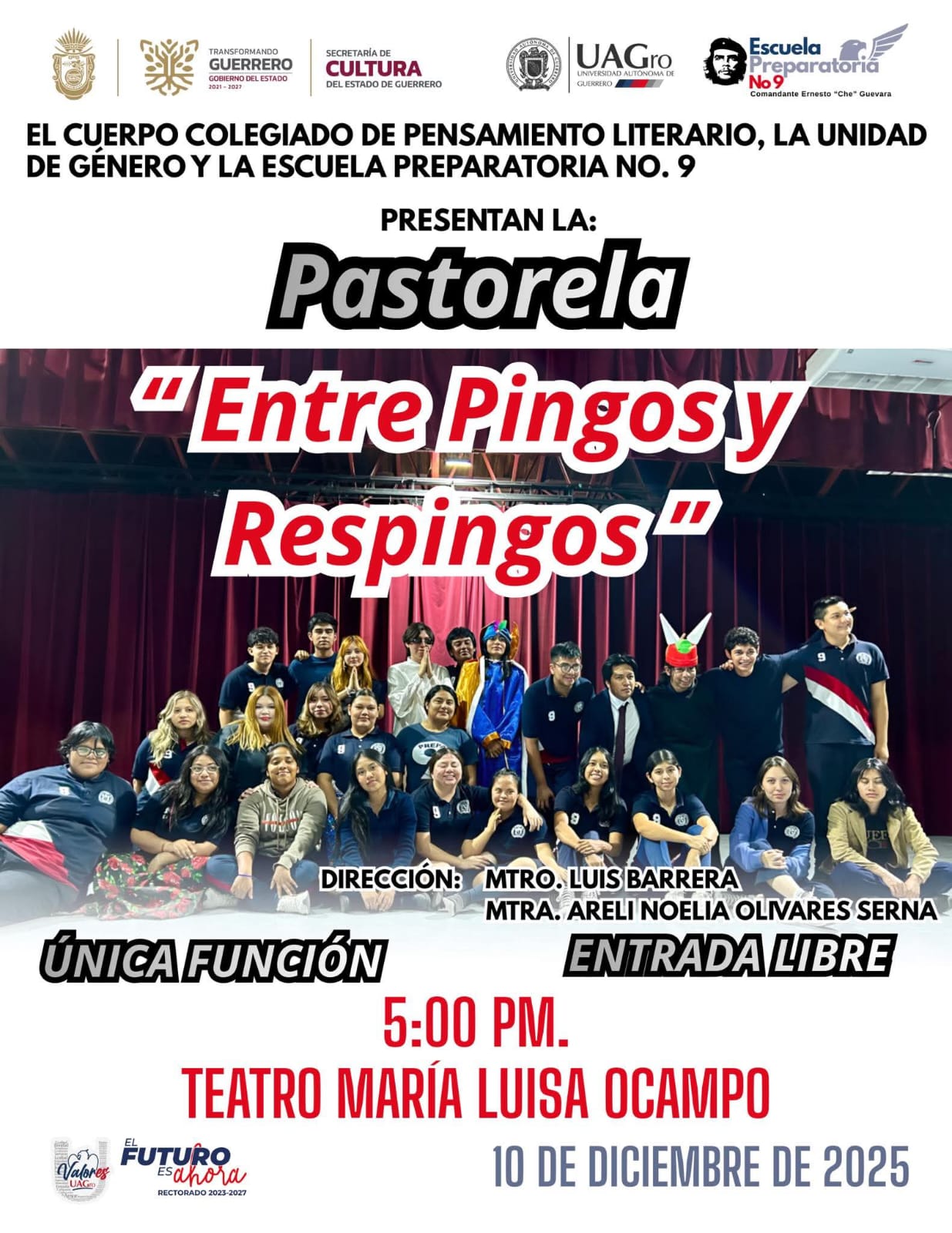 Como parte de la programación artística de la temporada decembrina, la Secretaría de Cultura de Guerrero llevará a escena la pastorela Entre Pingos y Respingos, dirigida por el maestro Luis Barrera y la maestra Areli Noelia Olivares Serna.