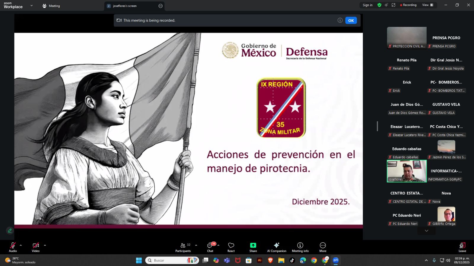 Chilpancingo, Gro., a 09 de diciembre de 2025.- Con el objetivo de prevenir incidentes relacionados con el uso inadecuado de artículos pirotécnicos durante las celebraciones de fin de año, la Secretaría de Gestión Integral de Riesgos y Protección Civil, en coordinación con la Secretaría de la Defensa Nacional, puso en marcha la capacitación virtual “Acciones Preventivas en el Manejo de la Pirotecnia”, dirigida a autoridades de los 85 municipios, así como al personal operativo de los ocho Centros Regionales de Atención a Emergencias.