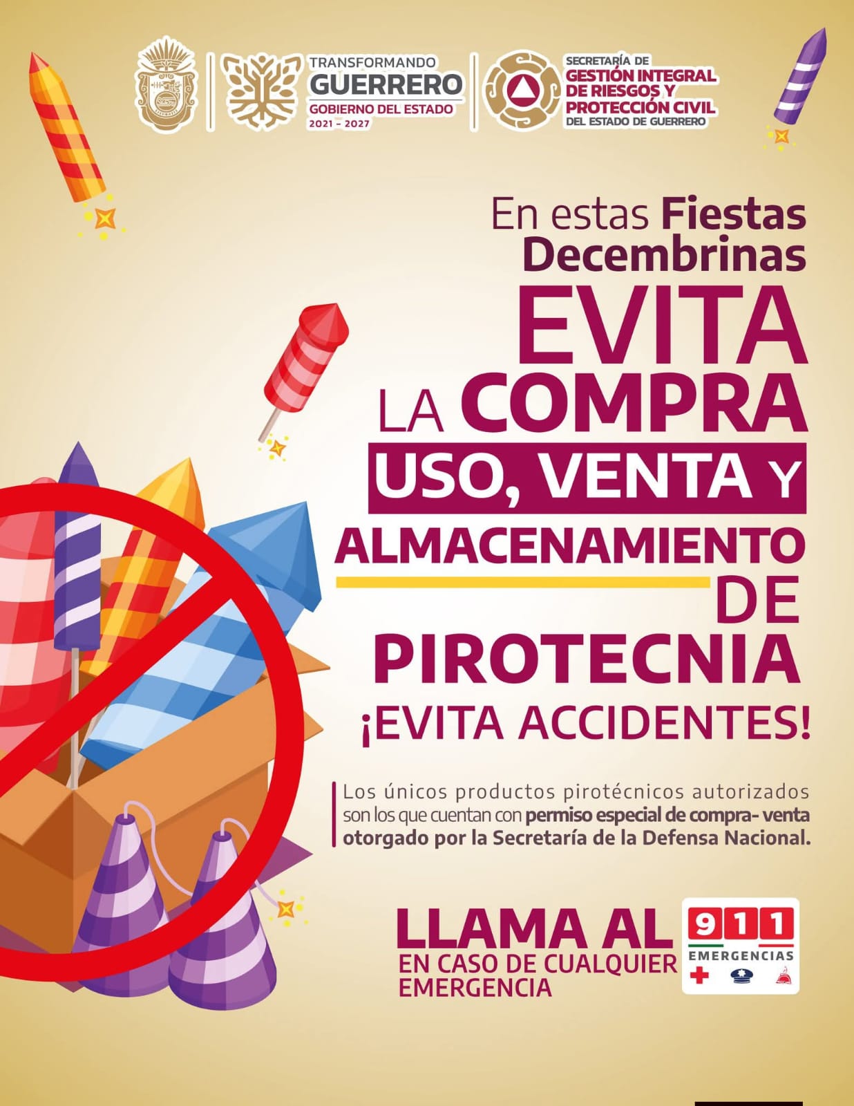 Con el objetivo de prevenir accidentes y salvaguardar la integridad de las familias, la Secretaría de Gestión Integral de Riesgos y Protección Civil exhortó a la población a evitar la compra, almacenamiento y uso de artículos pirotécnicos durante la temporada de fin de año.