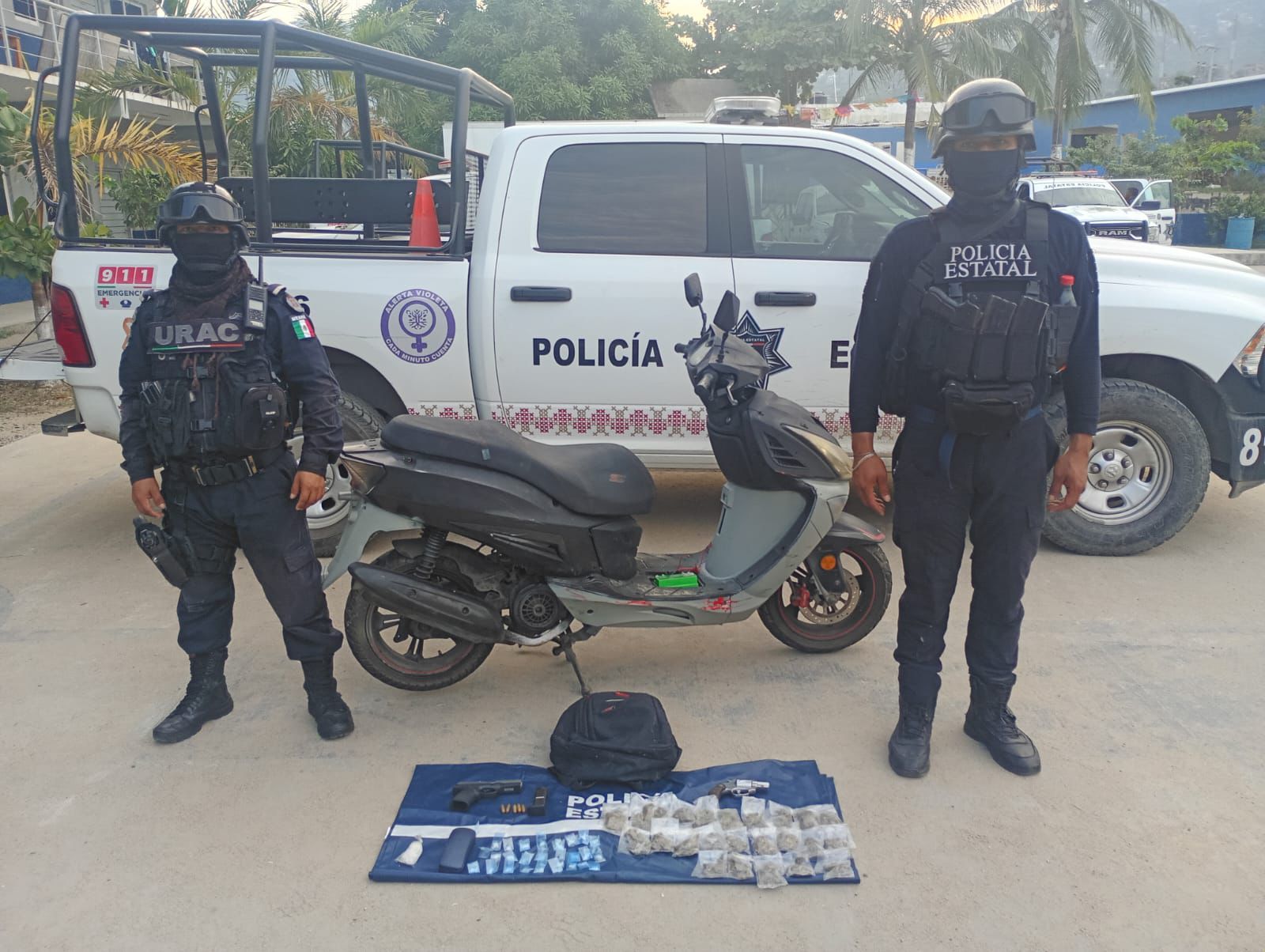 Chilpancingo, Guerrero; 15 de diciembre de 2025.- Personal de la Policía Estatal aseguró armamento, probable droga y una motocicleta en el municipio de Acapulco. El resultado se dio tras denuncias ciudadanas al número de emergencias 911, lo que derivó de patrullajes de vigilancia y prevención de delito.