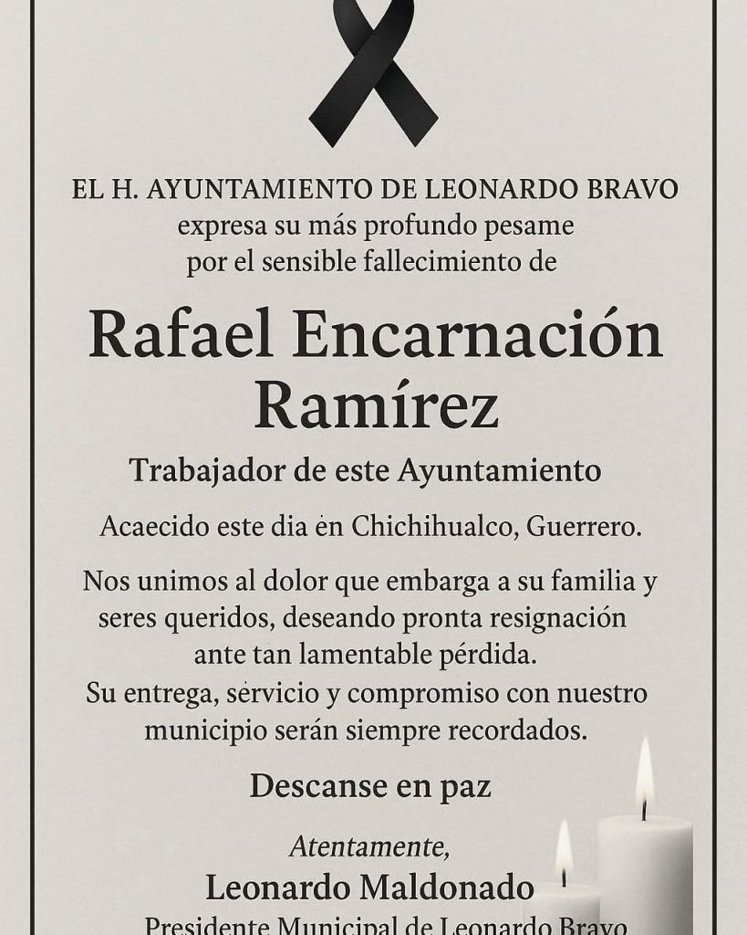 El municipio de Leonardo Bravo emitió una esquela lamentando este hecho en tanto el cuerpo del funcionario fue trasladado a su domicilio por sus familiares sin que se esperara el arribo de las autoridades, según trascendió.