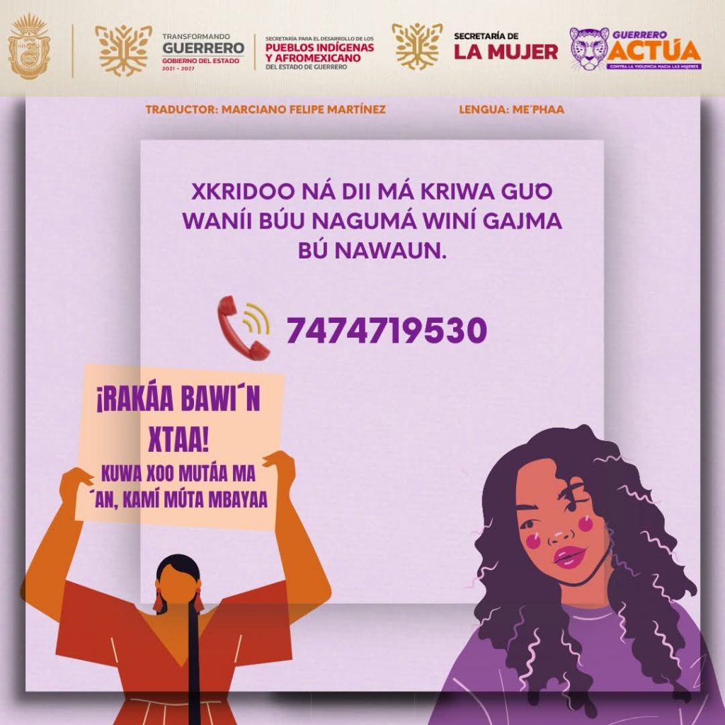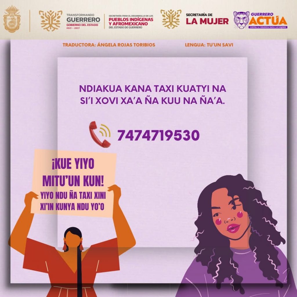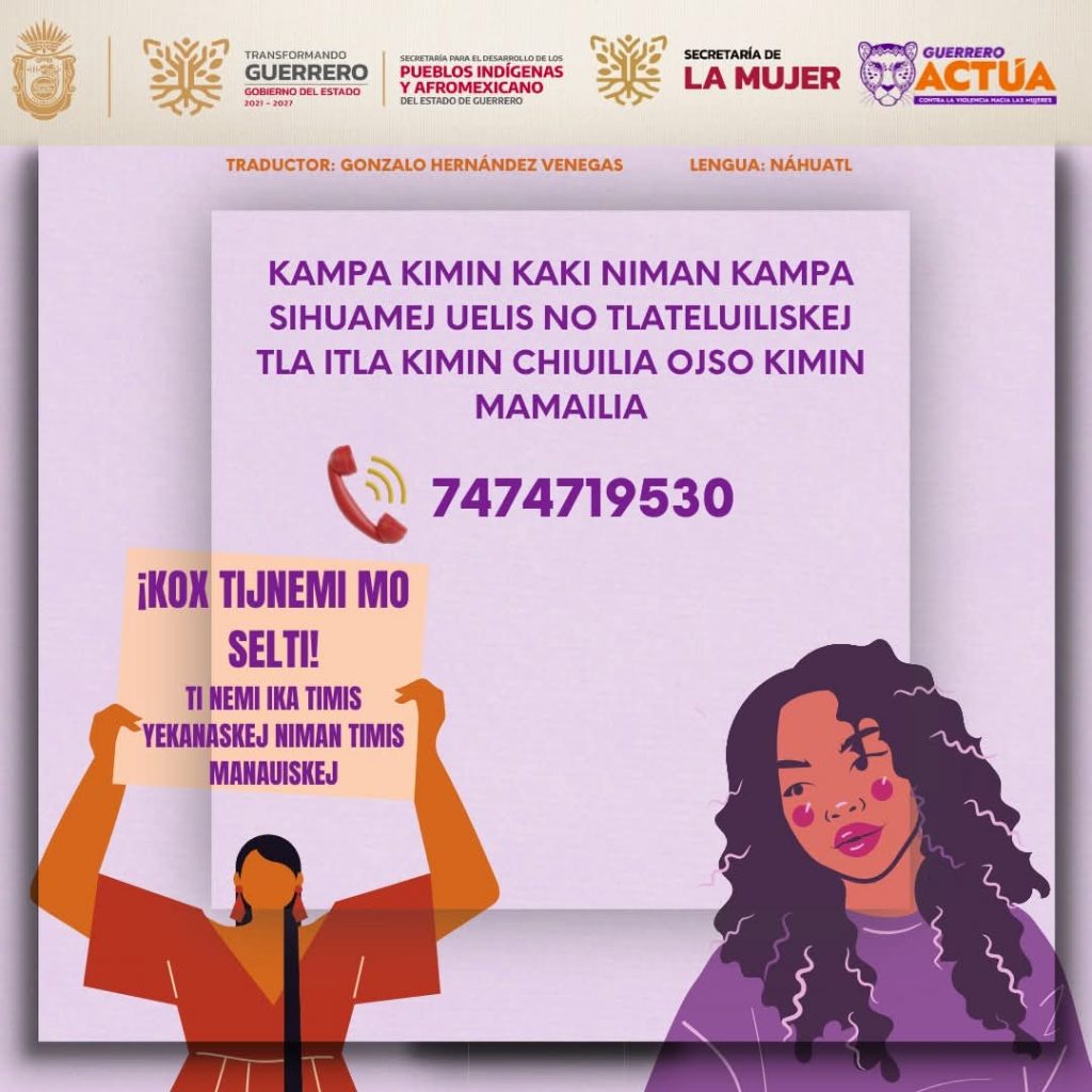 El servicio telefónico 747 471 95 30 proporciona atención, orientación y acompañamiento, y se difunde en las distintas lenguas originarias del estado, con el objetivo de que la información llegue de manera clara y accesible a mujeres de todas las regiones de Guerrero.