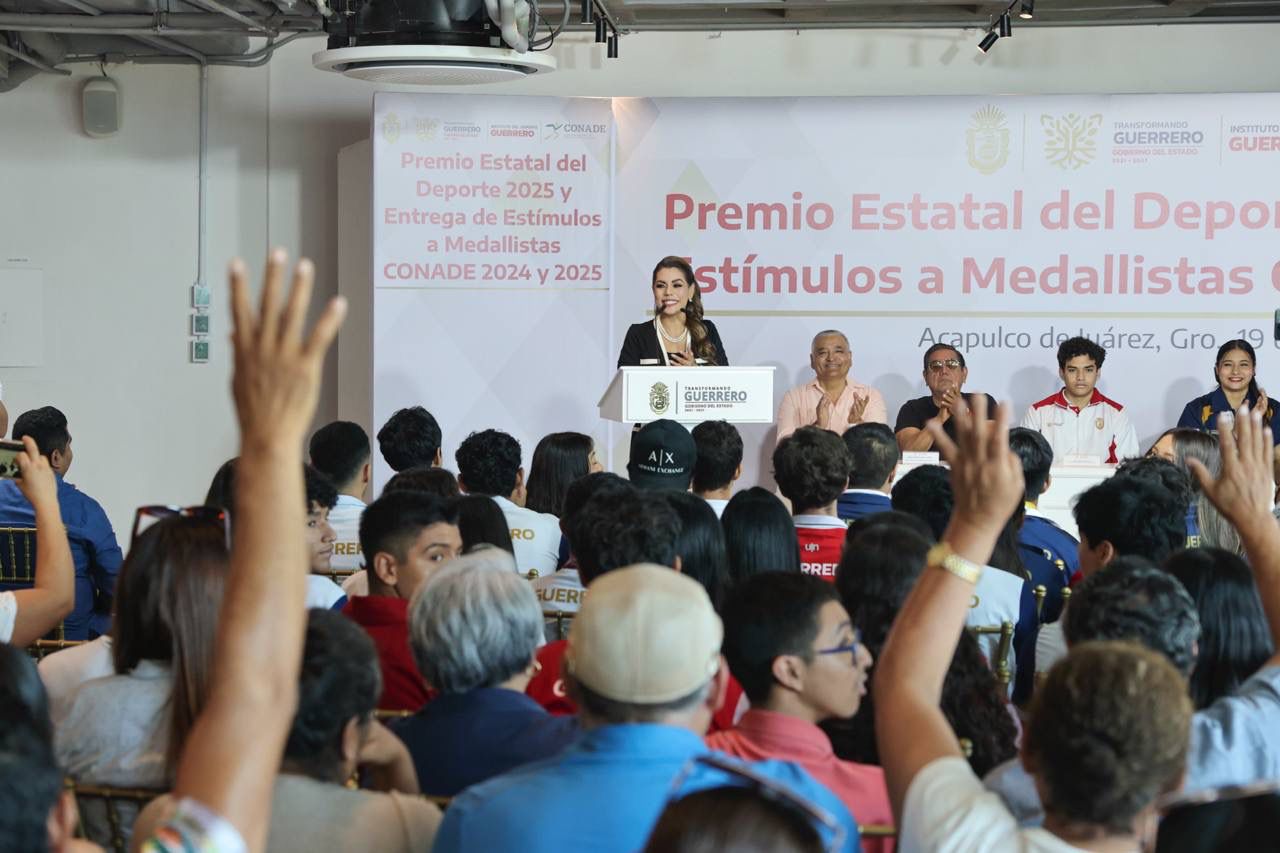 Acapulco, Gro., 19 de diciembre del 2025.- “Hoy reconocemos lo mejor del deporte guerrerense, entregamos estas medallas, las medallas del premio estatal del deporte 2025, y se otorga un estímulo a todas nuestras y nuestros medallistas que representaron a Guerrero en la Olimpiada Nacional, los Juegos Nacionales Populares, los Juegos Nacionales Indígenas y la Paraolimpiada 2024 y 2025”, señaló la gobernadora Evelyn Salgado, durante la entrega del Premio Estatal del Deporte 2025 y estímulos a medallistas que participaron en los juegos CONADE 2024 y 2025.