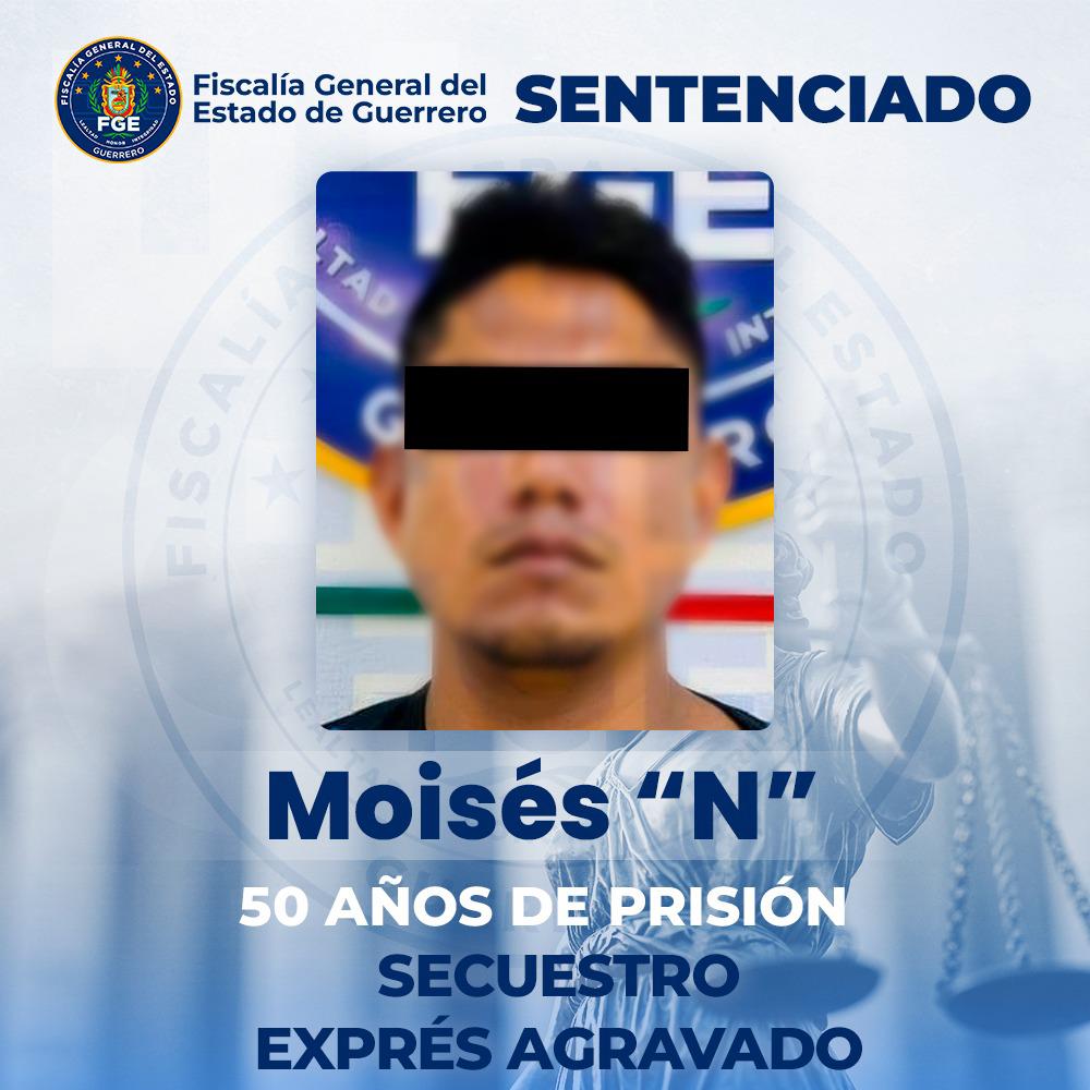 Chilpancingo, Gro., a 19 de diciembre de 2025.- La Fiscalía General del Estado de Guerrero, logró que un juez dictara sentencia condenatoria de 50 años de prisión en contra de Moisés “N” alias “El Derek”, por el delito de secuestro exprés agravado, cometido en perjuicio de una víctima de identidad reservada, en el municipio de Acapulco de Juárez.