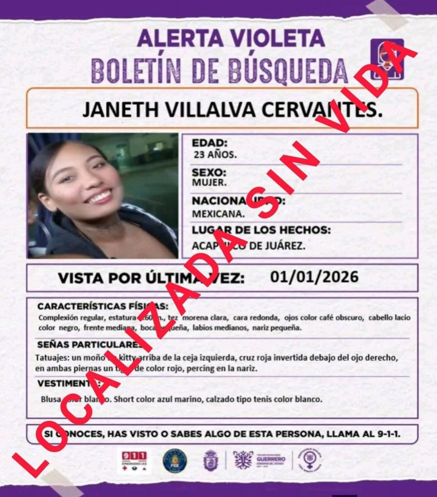 Acapulco, Guerrero., Enero 05-2026.- La hija del Alcalde electo de Copala, Janeth Villalva Cervantes, fue encontrada sin vida.