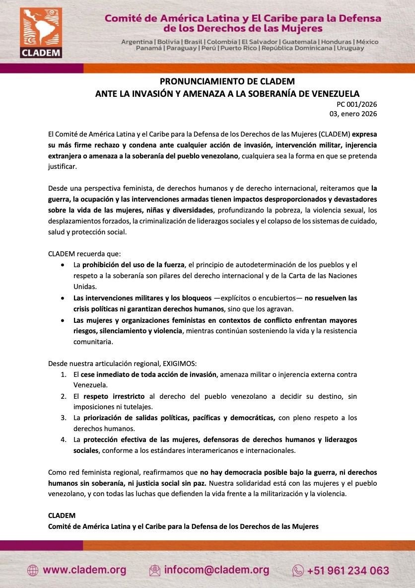 SemMéxico, Guadalajara, Jalisco,3 de enero, 2025.- Desde el Comité de América Latina y el Caribe para la Defensa de los Derechos de las Mujeres (CLADEM), “ rechazamos y denunciamos la gravísima agresión militar perpetrada por el Gobierno de los Estados Unidos contra la República Bolivariana de Venezuela en la madrugada del 3 de enero de 2026”, señala un comunicado de CLADEM hoy..