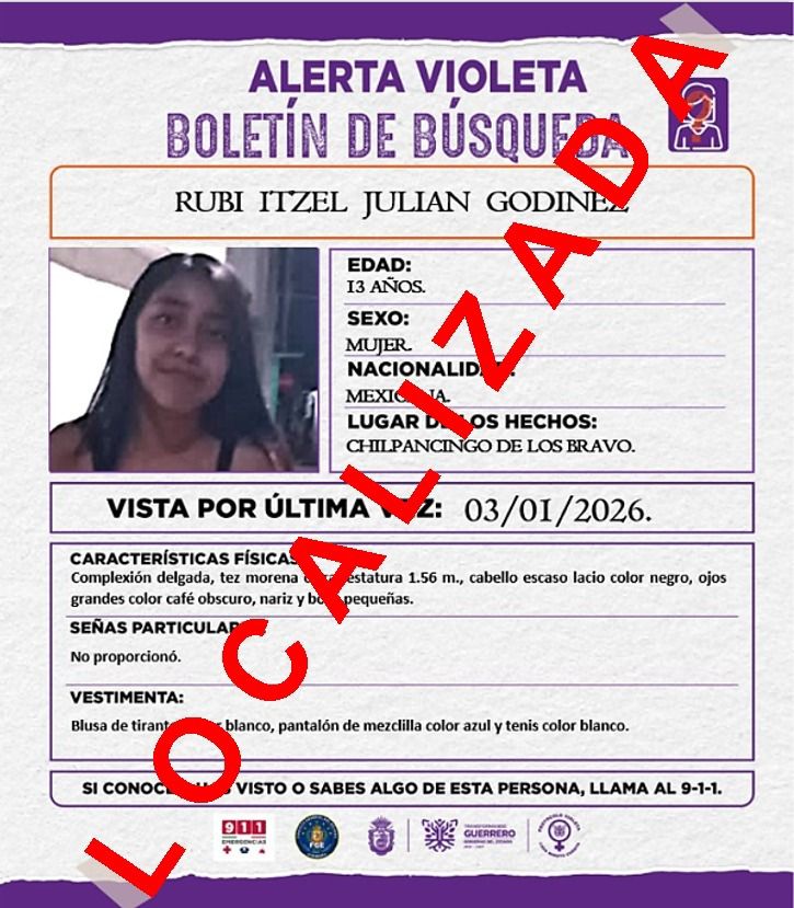 Chilpancingo, Gro. 8 de enero del 2026. La Secretaría de Seguridad Pública del Estado de Guerrero informa que, derivado del seguimiento a una Alerta Violeta por la no localización de la adolescente Rubí N., de 13 años de edad, se mantuvo coordinación permanente con autoridades municipales y estatales para su recuperación.