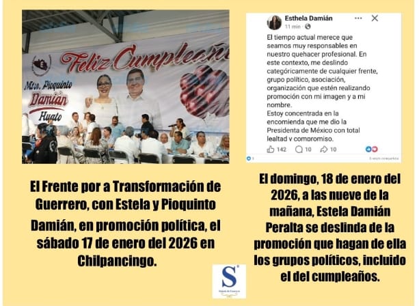 Chilpancingo, Gro., a 18 de enero del 2026 (SG). – Mas tardó el polémico Pioquinto Damián Huato en festejar su cumpleaños en un salón de fiestas de Chilpancingo, utilizando la imagen de su sobrina, Estela Damián Peralta y el logotipo de un Frente por la Transformación de Guerrero, que ella, a quien impulsan para ser candidata a gobernadora de Guerrero, se deslinde y niegue su participación en cualquier grupo político y que ella está dedicada a su trabajo en el gobierno federal de tiempo completo.