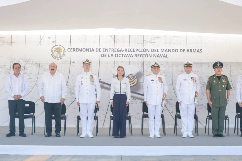 Ante el subsecretario de Asuntos Marítimos y Portuarios de la Secretaría de Marina, Gerardo de Jesús Toledo Guzmán, la jefa del Ejecutivo estatal, agradeció y reconoció el trabajo que realizó el comandante Carlos L’Eglisse Escamilla, así como su entrega, sensibilidad y lealtad institucional que demostró en el territorio.