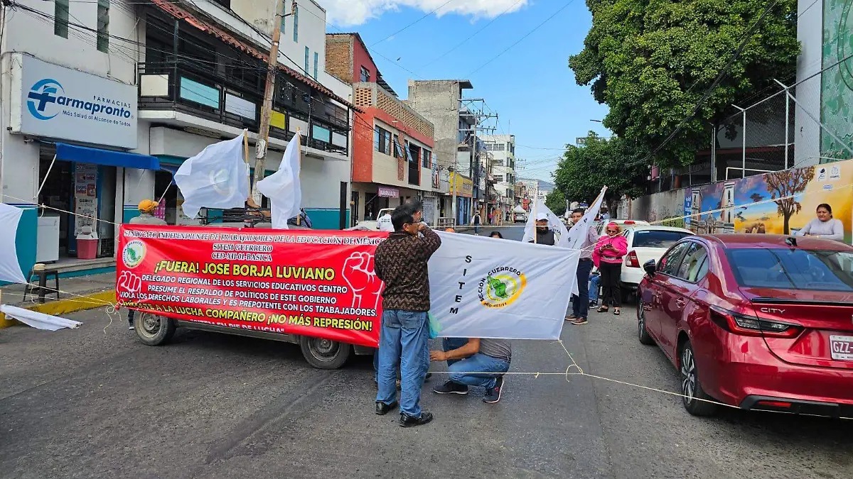 Maestros afiliados del Sindicato Independiente de Trabajadores de la Educación en México (SITEM) realizar un bloqueos en calles de Chilpancingo para exigir la destitución del delegado de servicios educativos en la región centro José Borja Luviano a quien acusan de maltrato a su subordinados.
