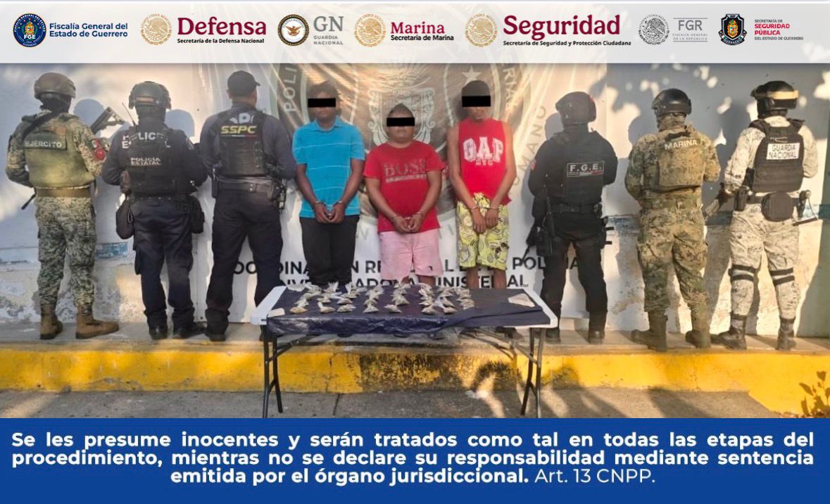 Chilpancingo, Gro., a 24 de enero de 2026.– La Fiscalía General del Estado de Guerrero informa que, personal de esta institución, en coordinación con DEFENSA, Guardia Nacional (GN), Secretaría de Marina (SEMAR), Secretaría de Seguridad y Protección Ciudadana (SSYPC) y Policía Estatal, realizó la detención en flagrancia de Eduardo “N”, Donaldo “N” y Luis “N”, municipio de Acapulco de Juárez, Guerrero.