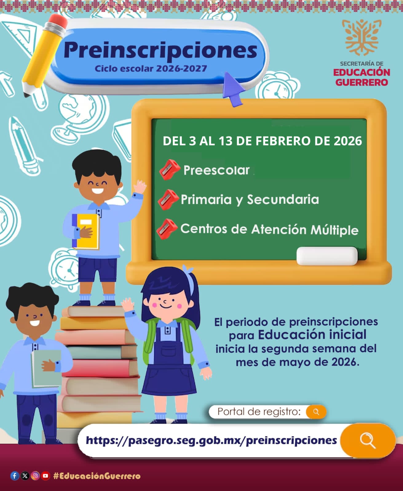 Chilpancingo, Gro., 14 de enero de 2026. La Secretaría de Educación Guerrero (SEG) emitió la circular para el proceso de preinscripciones para educación básica, que se llevará a cabo del 3 al 13 de febrero.