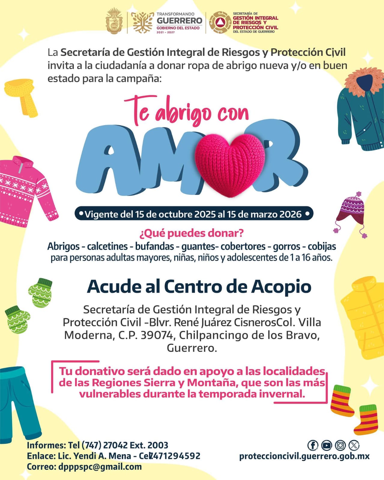 El Gobierno del Estado, a través de la Secretaría de Gestión Integral de Riesgos y Protección Civil, reitera la invitación a sumarse a la colecta “Te Abrigo con Amor”, una iniciativa que busca brindar apoyo a las familias que enfrentan las bajas temperaturas en las regiones más frías de Guerrero.