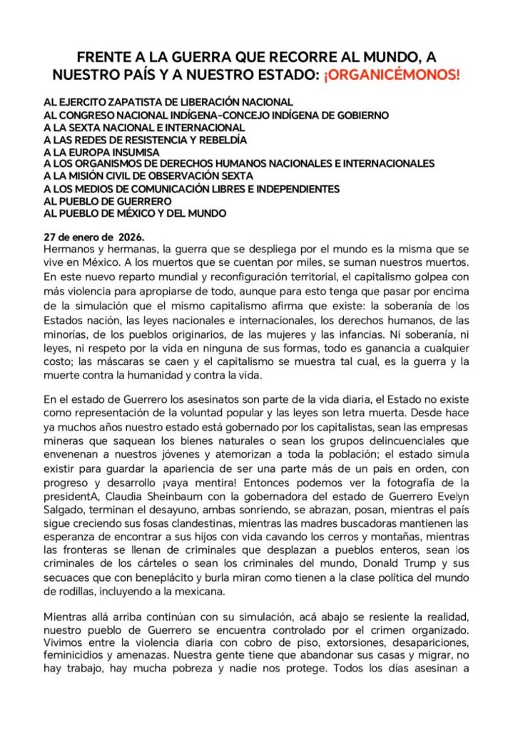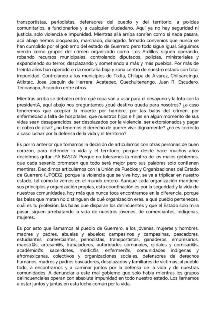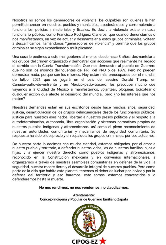 El CIPOG-EZ, Consejo Indígena y Popular de Guerrero – Emiliano Zapata, y la UPOEG, Unión de Pueblos y Organizaciones del Estado de Guerrero, emitieron un comunicado con el cual, señalan, dan respuesta a señalamientos que dicen han vertido funcionarios estatales.