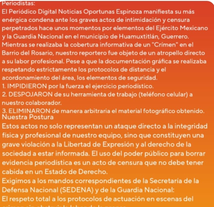 El Periódico Digital Noticias Oportunas Espinoza manifiesta su más enérgica condena ante los graves actos de intimidación y censura perpetrados hace unos momentos por elementos del Ejército Mexicano y la Guardia Nacional en el municipio de Huamuxtitlán, Guerrero.