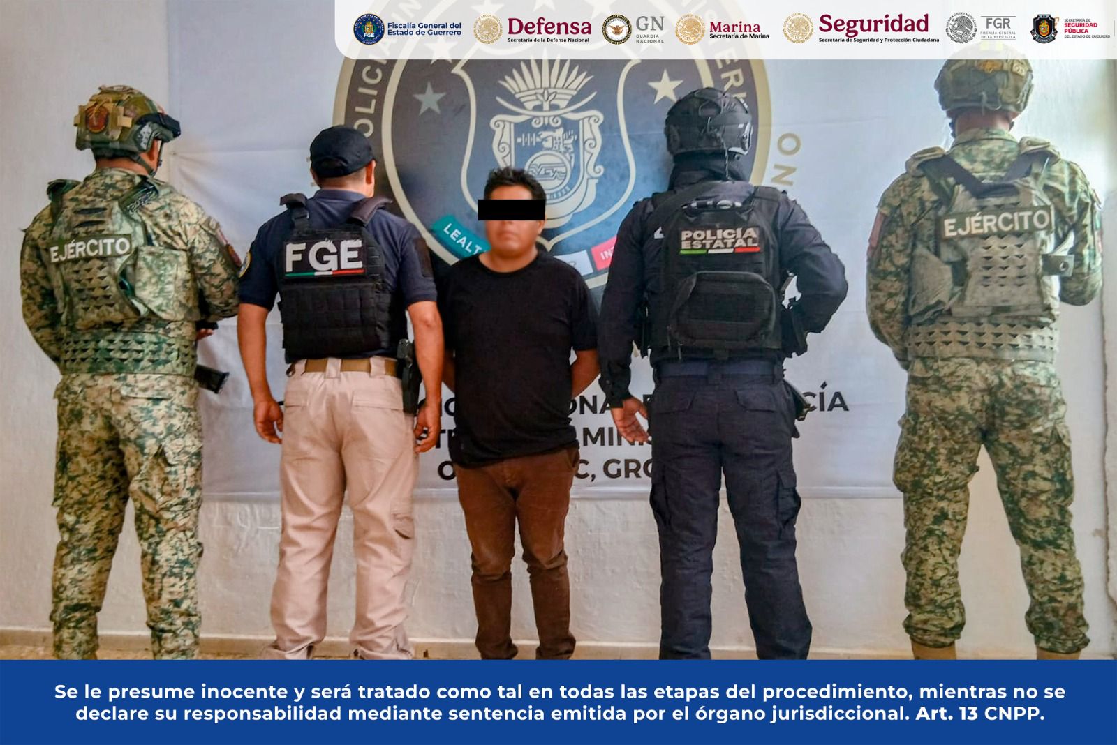 Chilpancingo, Gro., a 1 de febrero de 2026.– La Fiscalía General del Estado de Guerrero informa que, en coordinación con DEFENSA, Guardia Nacional (GN), Secretaría de Seguridad y Protección Ciudadana (SSPC) y Policía Estatal (SSPGro), cumplimentó una orden de aprehensión en contra de Luis “N”, por el delito de homicidio en razón de parentesco, en agravio de Rafael “N” y Raquel “N”, en el municipio de Ometepec, Guerrero.