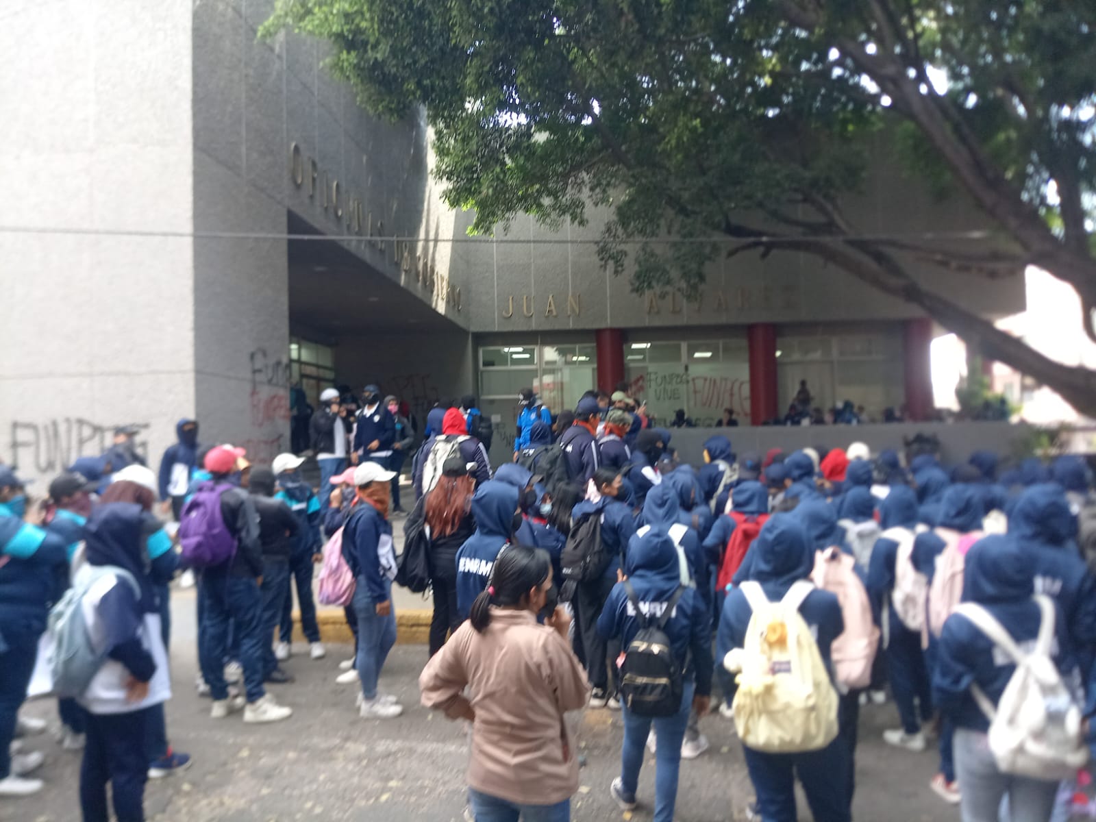 Posteriormente bloquearon los accesos y procedieron a realizar pintas al edificio en el que plasmaban sus demandas.