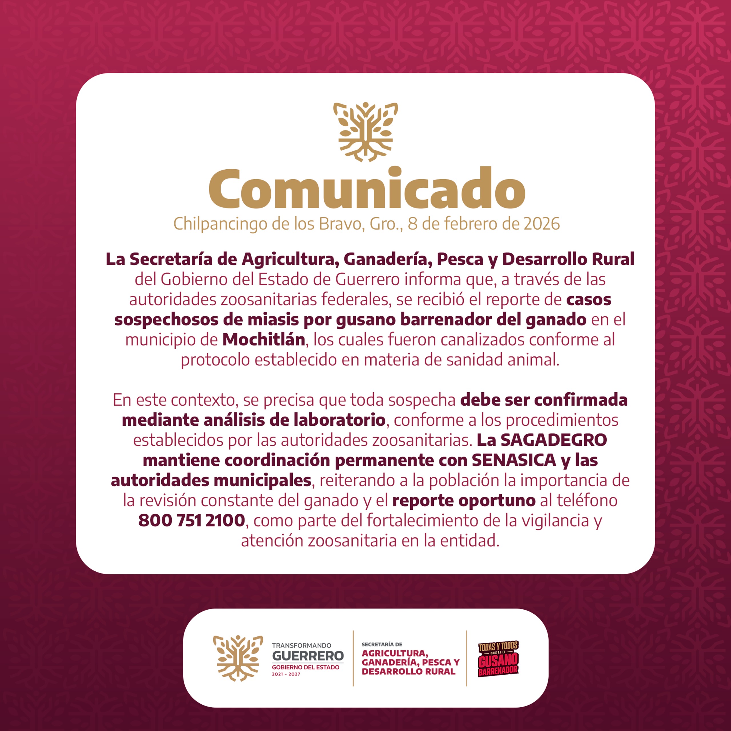 Informo a la poblaci贸n de Mochitl谩n que se han detectado algunos casos del gusano barrenador, por lo que hago un llamado a la ciudadan铆a para tomar las debidas precauciones.