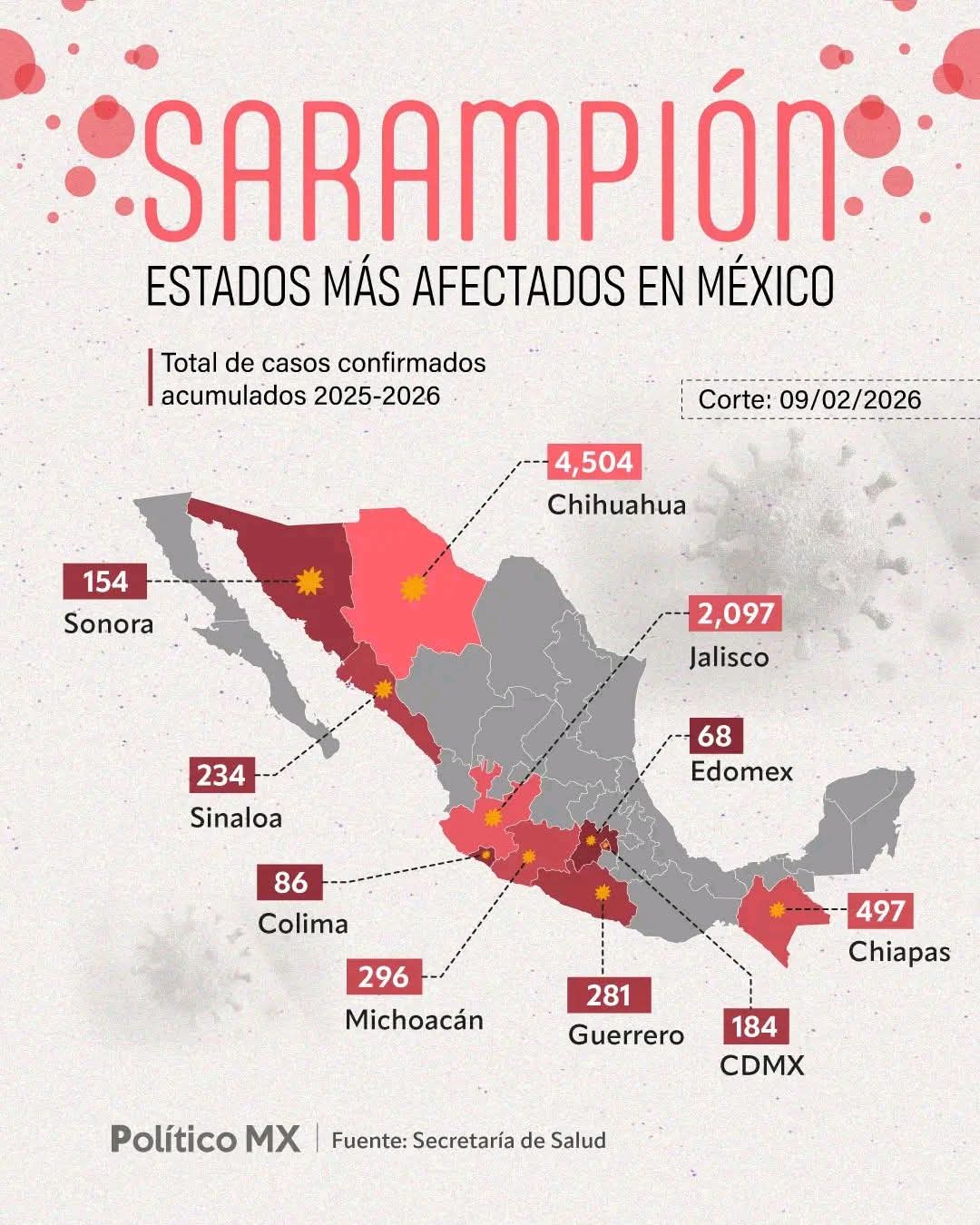 También dio a conocer que hasta el 9 de febrero tienen documentados 22 mil 425 casos probables y que se han confirmado a sarampión 8 mil 889.