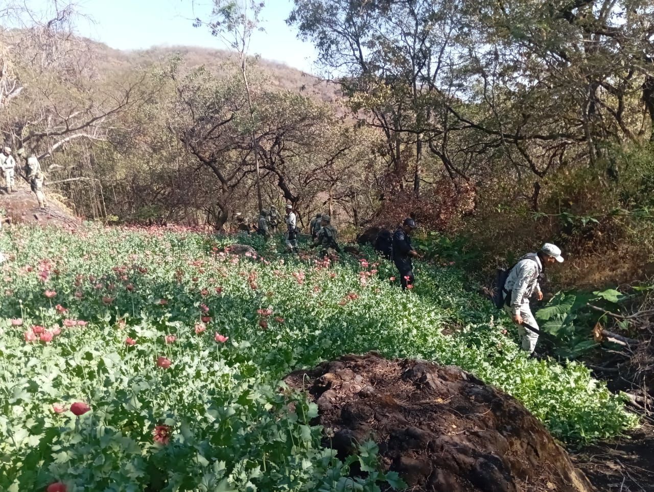 Ajuchitlán del Progreso, Gro., 11 de febrero de 2026. Como resultado de acciones coordinadas de la Base de Operaciones Interinstitucionales (BOI), integrada por personal de la Policía Estatal y del Ejército Mexicano, fueron localizados plantíos de marihuana y Amapola en zonas serranas del municipio de Ajuchitlán del Progreso.