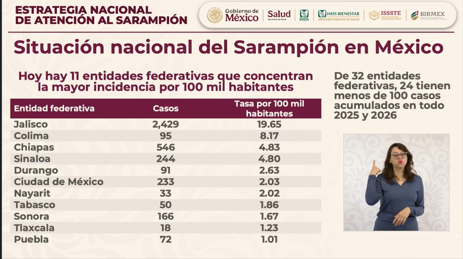 Las estadísticas presentadas en la “Estrategia Nacional de Atención al Sarampión” muestran un panorama dividido. Mientras que Jalisco encabeza la lista nacional con 2,429 casos y una tasa de 19.65 por cada 100 mil habitantes, Guerrero ha logrado contener la transmisión, evitando entrar en el grupo de las 11 entidades prioritarias donde la tasa de contagio no supera el 1.0.