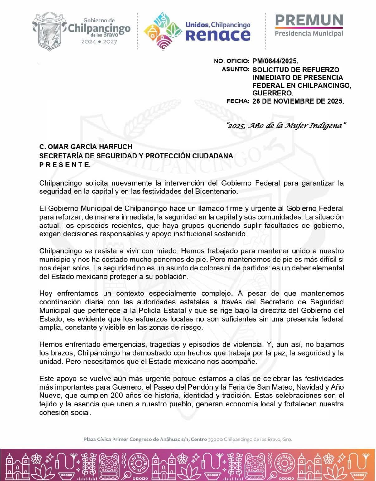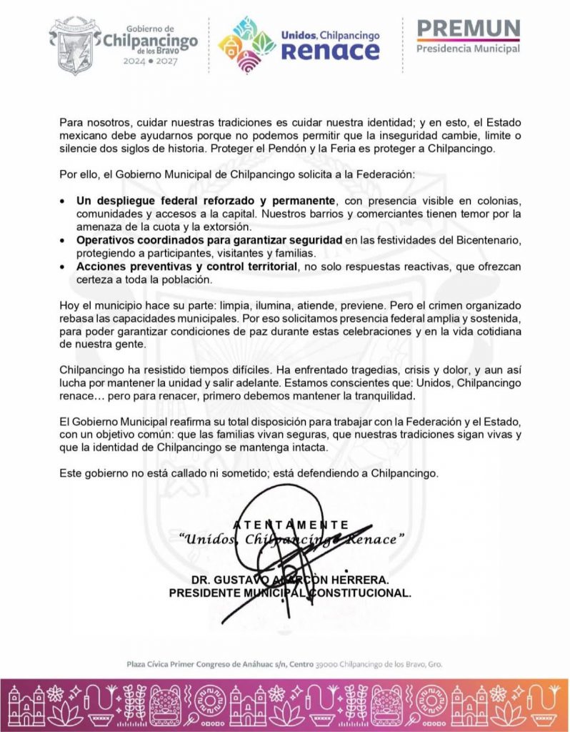 En el documento se solicita reforzar la presencia federal en la capital, señalando que, aunque el municipio se ha mantenido en pie, la situación requiere apoyo inmediato para garantizar seguridad a las familias y en el marco del Bicentenario de la Feria de Chilpancingo.