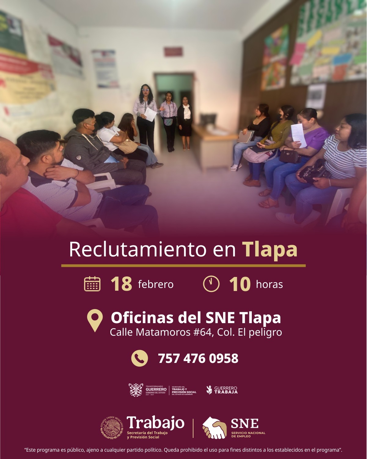 Con el objetivo de generar más oportunidades de empleo para la población, la Secretaría del Trabajo y Previsión Social inició este día una jornada de reclutamiento en el municipio de Tlapa, donde seis empresas ofertan un total de 50 espacios laborales.